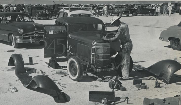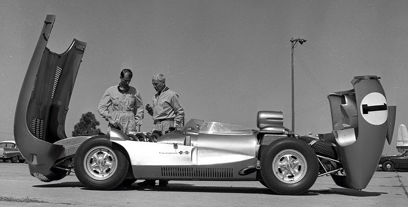 In 1957 SCTA changed the rules which specified "no chop tops", the cars had to be stock height. So Lou made a fibergl*** cap that extended the top of his roof by 4" so the top of the car was now stock height. In 1958 the SCTA reversed the roof rules, and the cap was easily, and simply, removed without any bodywork to the roof to comply with one stupid rule only in effect for one race season