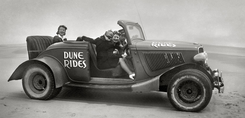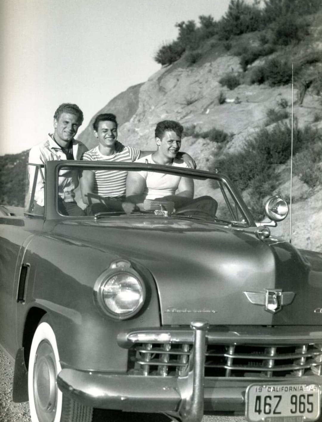 Wingfoot Express on the salt flats at Bonneville, Utah, 1964. Walt Arfons (left) and Tom Green pose with their jet-powered land speed record car.
