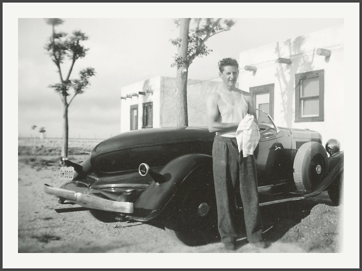 Driver Babe Stapp & riding mechanic Johnny Apple in Pirrung Special Shaw-Offy w/ Chevy Suburban in background, 1936 Indianapolis 500.