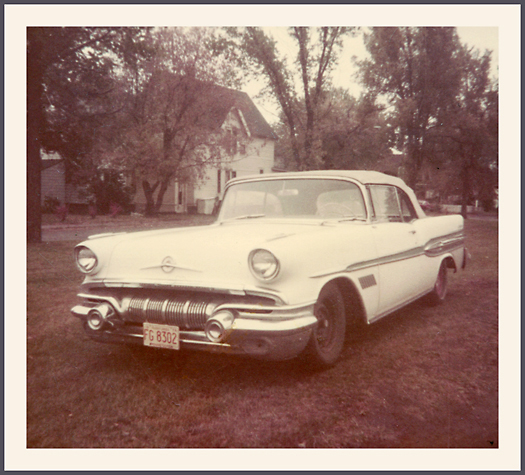 1957 Pontiac Bonneville Convertible, 1 of 630, w/ 1974 Minnesota plates, its original fuel injection apparatus most likely in a cardboard box that I know is around here somewhere...