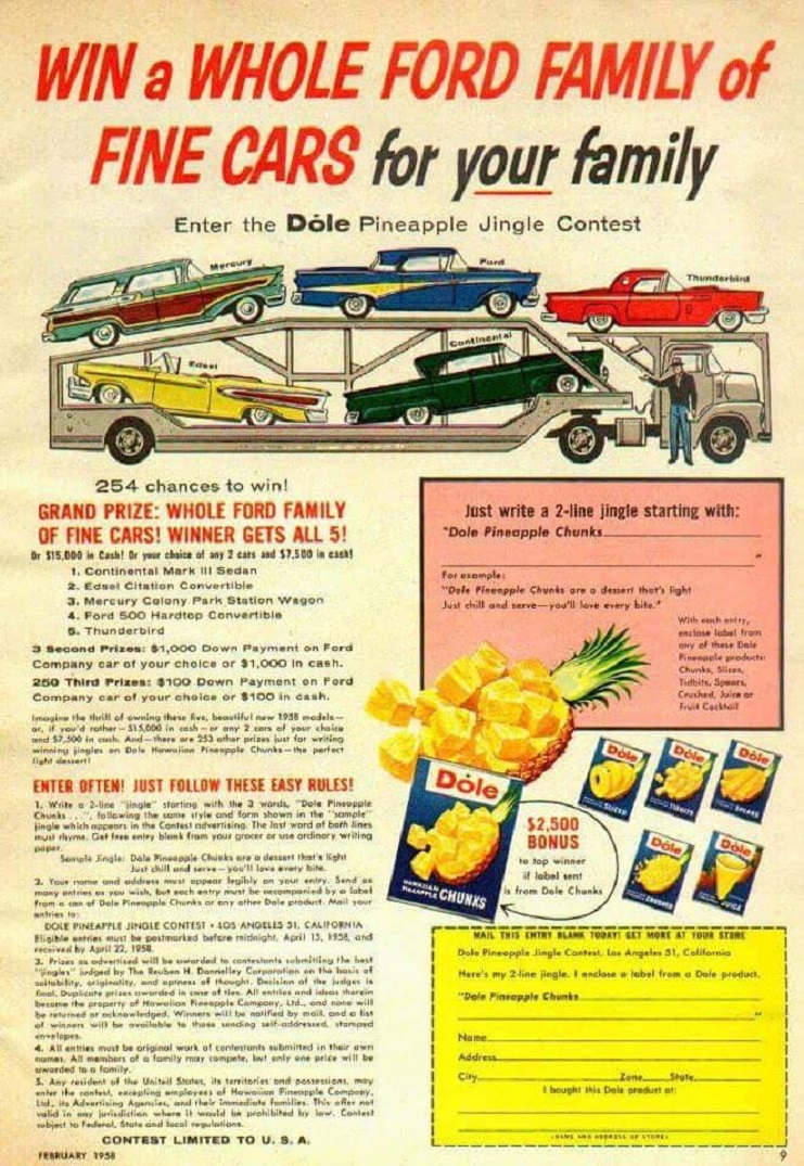 The date on the ad shows February 1958, with magazine lead times that could have been published a month or two earlier. Production of the Square Birds didn’t start until very late December 1957 so no doubt Ford didn’t give their OK to show the new car that might not have been released yet due to production issues.
