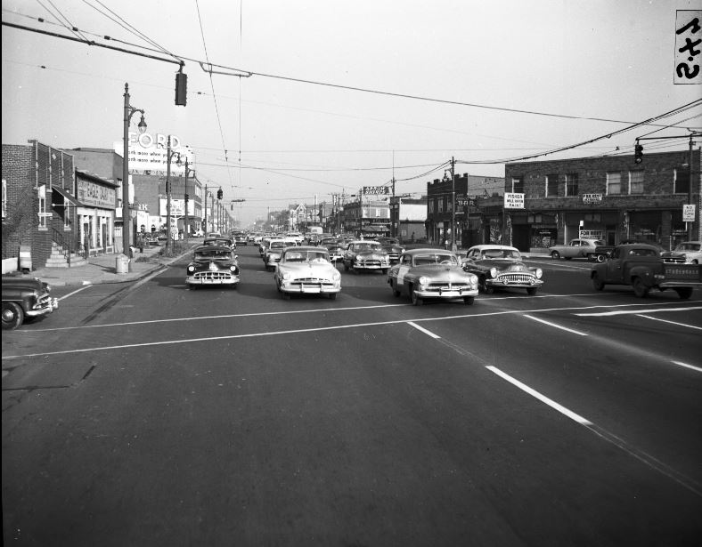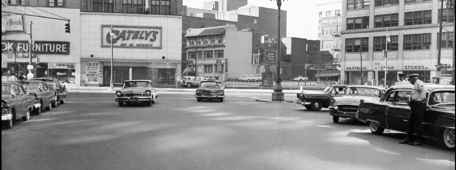 1957 - SW Broadway & SW Columbia St. - Portland Oregon - I lived in that building on the right for 6 months while going to college. That Chevron is now a skyscraper.