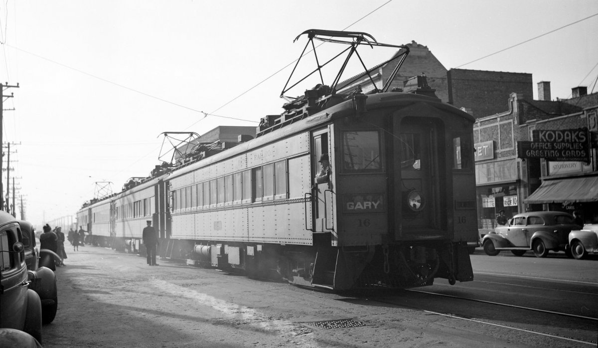 The Chicago South Shore & South Bend Railroad, probably street running here in Michigan City, IN. Still running today as the South Shore Line it serves commuters from northern Indiana going to Chicago for work, shopping and the sights and sounds of the big city.