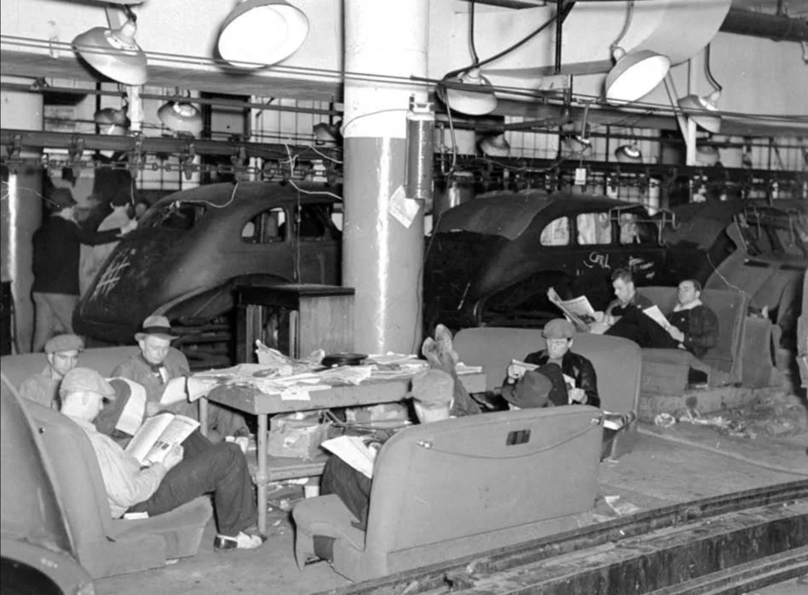 Workers at a GM Flint, MI plant during the 1937 sit down strike. Recognition of the UAW was the result and unionization of the auto industry followed.