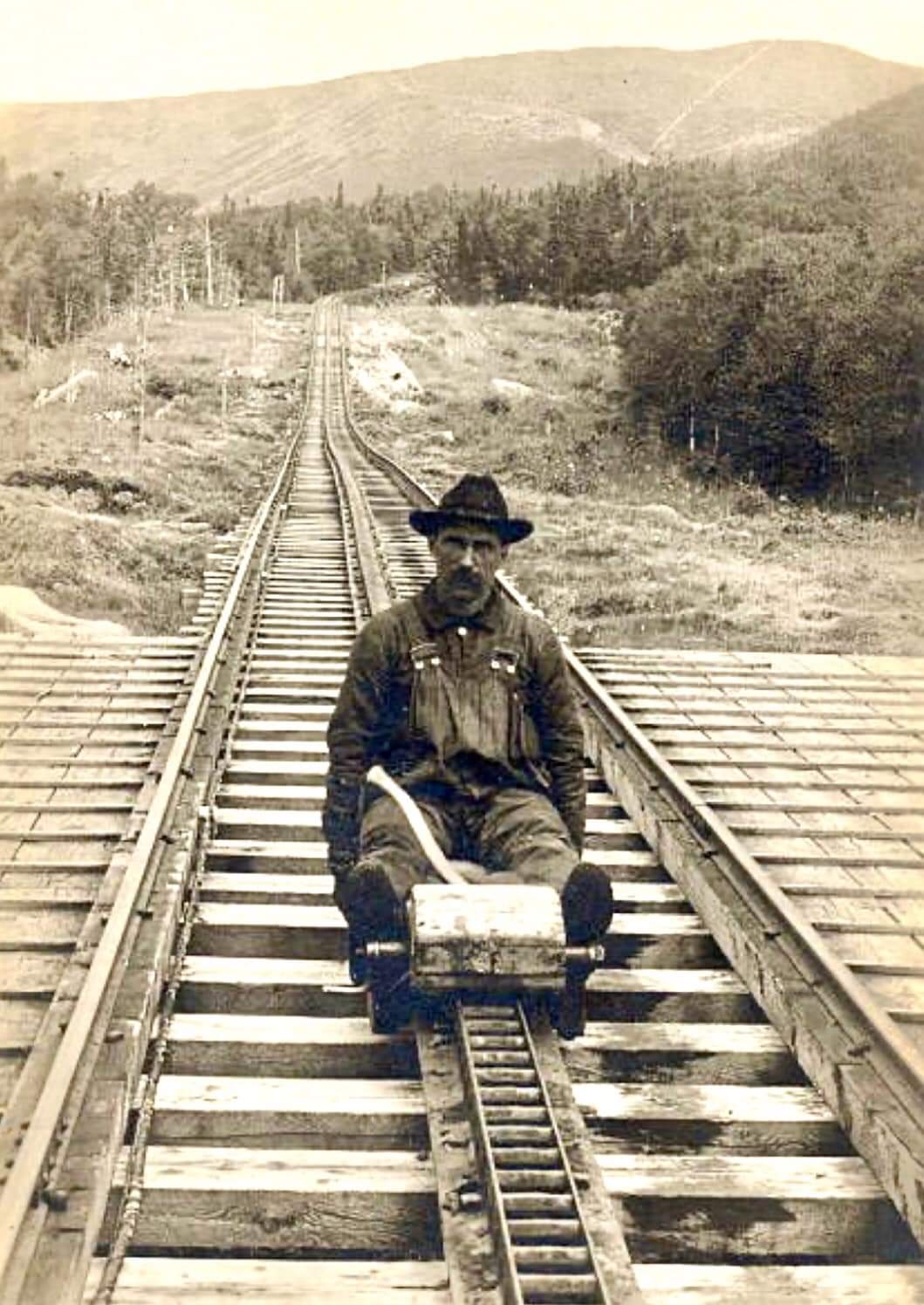 "Devils Shingle" Mount Washington NH. Employees would ride these at break neck speeds down. Then someone got off'd. There is one(maybe this one; in the base museum in Franconia). His hands are on lever brakes. basically wood that levered into the ties to slow you. The fastest time down was fairly idiotic if i remember right.