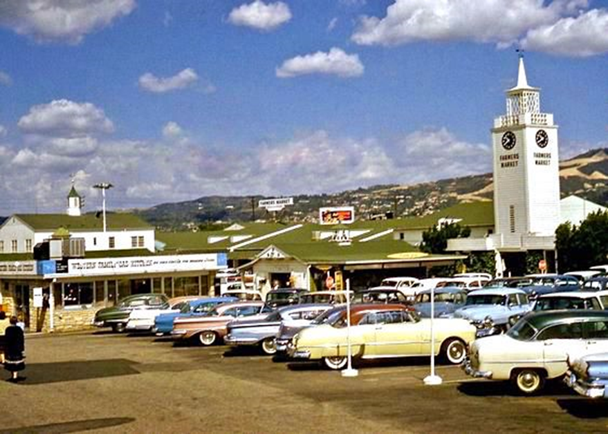 Hello, The photo looks like somewhere in the 1958 timeline, with a silver blue 58 Impala in the center of the photo. The cool thing was the 4 door Cadillac parked next to a 57 Chevy Nomad. The location is the Farmer’s Market in the Fairfax Area of Los Angeles. Just around the corner was the famous Pan Pacific Auditorium with its cool front structure. That place was one of the first locations to showcase the early automotive industry car shows every August/September with the latest from the factories. Our dad took us there in the early 5o’s for the shows and a nice lunch at the Farmer’s Market where we would get fresh produce for the family and goodies for the sons. One of the big attractions is the Television City location just up the block from 1952 onward. (live TV shows with audiences were recorded there...) Prior to that bit of history, the location was the famous Gilmore Stadium for auto racing and prior to that, a baseball field for Los Angeles pro baseball teams. (prior to the Dodgers coming out West...) Jnaki As history would have it, over the years of our 20 something days, my wife and I loved going up to the Fairfax District for the local scenery and delicious food at the Farmer’s Market and a funky place called Canter’s Restaurant. The food there is/was historic and it was a place for other local scene “rock” stars to wander in late at night. Then, jump up to the 2009 and the next generation of our family goes to the Grove in Los Angeles (Old Farmers Market) to visit the famous American Doll Store of Los Angeles. Our granddaughter could not have been happier as a huge smile came across her face. But, time marches on, as it has since closed and moved several blocks away in a larger store location. The Farmer's Market still exists with the new name of "The Grove," but it still has the feeling of the good old days...! It is a "Cool Roadside Attraction" for plenty of visitors from within the city or out of state travelers. YRMV