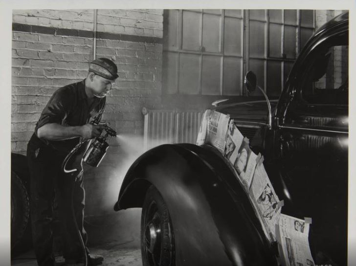 Mechanic grinding Fender, Dahlinger and Kay Ford Dealership, Highland Park, Michigan, 1939 Mechanic Paints Fender at Dahlinger and Kay Ford Dealership, Highland Park, Michigan, 1939 Navy A-4 skyhawk