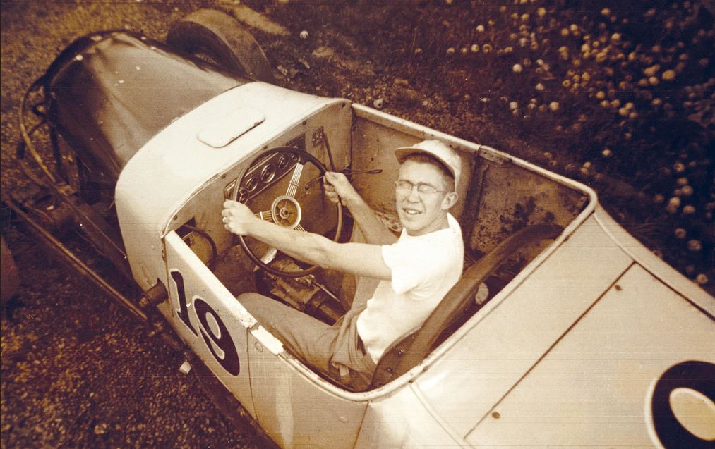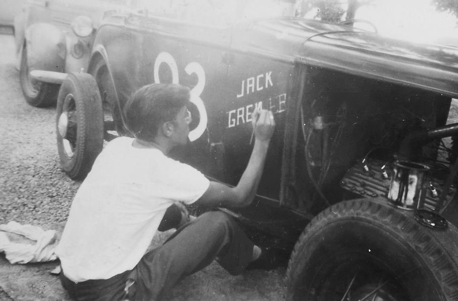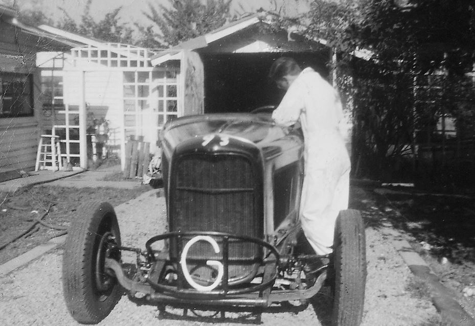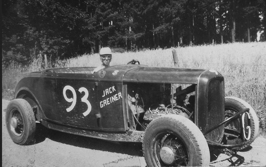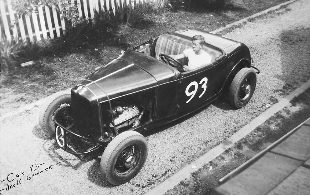 Today is the Greiner Family history day Eva and Dewey Greiner Jack's parents Jack Greiner roadster above view Jack at wheel 1927 T Roadster Dick Clevenger first owner Jack first drive at the track Jack Greiner in his last roadster in1955 At his garage space 1955 Jack McFarland lettering Getting it ready for the track In the car Shakedown run Don Waters offy equipped flathead Replacing head gaskets 1950 Wife Rolleen Jack with Don Porter