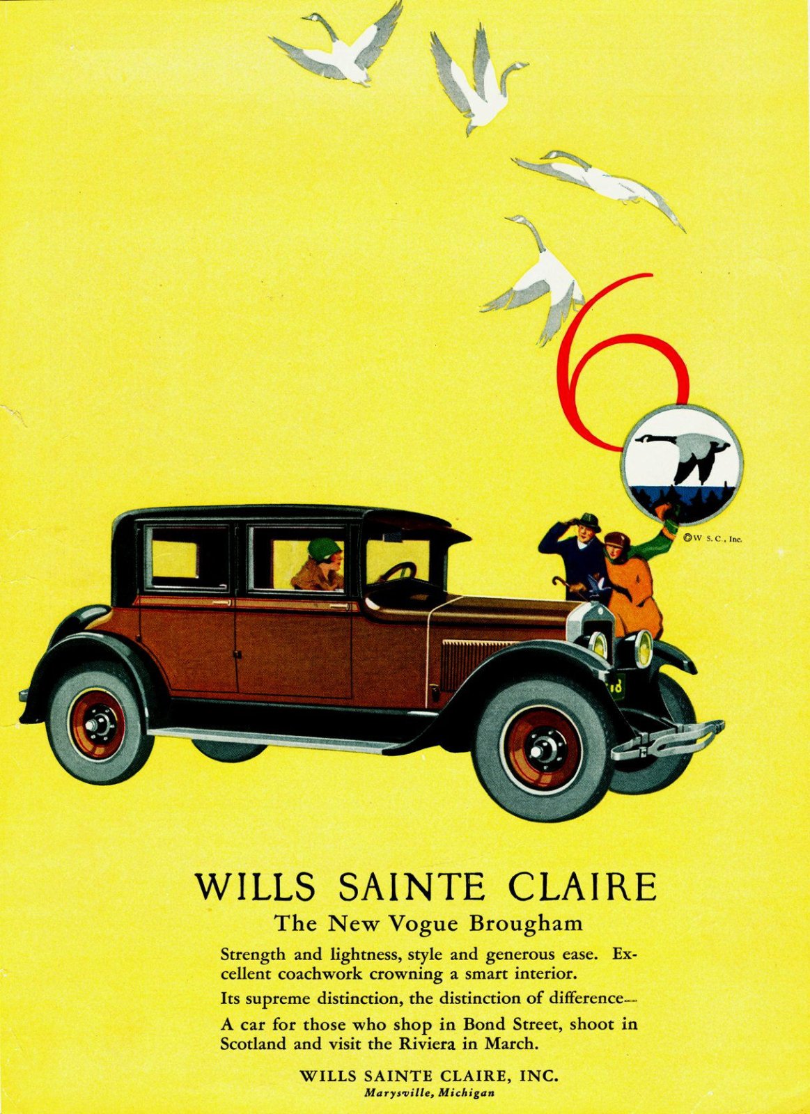 C. H. WILLS - 1878-1940 Childe Harold Wills had been employed by Henry Ford as a metallurgist and chief engineer. Forever known as a perfectionist, Wills was the inventor of Vanadium steel, a metal known for its strength and durability and molybdenum steel alloys. Every model of Ford's cars was made of this time-tested steel and proved to be the leading material in Henry Ford's automobile production. The infamous Ford logo, still present on all Ford vehicles today, was designed by C.H. Wills and like his Vanadium steel, it has withstood the test of time. Wills had accomplished much when employed by the Ford Motor Company which was still in the early stages of producing world class automobiles. Wills left the Ford company on his own volition in 1919 to pursue designing and manufacturing his own automobile. WILLS ST. CLAIRE AUTOMOBILE PRODUCTION 1926 Phillips Bodied Cabriolet Roadster Feeling his creativity unnecessarily restricted, Mr. Wills resigned in 1919, cashed in his Ford stock for $1.5 million, and set off on his own, explaining, "I am anxious to do something worthwhile and this seems the opportunity to start." Taking some Ford people with him, Mr. Wills founded C.H. Wills and Co. and announced plans to build the Wills Sainte Claire, a somewhat futuristic automobile that used state-of-the-art engineering concepts and materials. Wills St. Claire Northern Goose logo During World War I demand spurred rapid development of a huge, very low grade molybdenite deposit being mined by the newly formed Climax Molybdenum Co. at Bartlett Mountain, Colo. The mine did well during the war, but when it ended the molybdenum market collapsed and the mine was closed. In 1920, Climax consisted of a president, Brainerd Phillipson, an entire mountain of molybdenum and a huge stockpile, but no market for the metal. Mr. Phillipson soon met Mr. Wills and sold his stockpile to the auto mogul " for next to nothing. " When the first Wills Ste. Claire Model A-68 rolled off the Marysville, Mich., assembly line in the spring of 1921, virtually every component subject to even minimal stress was made of molybdenum steel, including the crankshaft, connecting rods, camshaft, gearbox gears and shafts, propeller shaft, frame, springs, front axle, steering knuckles and wheels. Available in three standard colors, "Lady Mary Maroon," "Newport Blue," and "Liberty Green," the Wills Ste. Claire was pure luxury. The Wills V-8 produced 67 hp at 2,700 rpm, more than enough for contemporary performance standards. Criticism focused on the length of the wheelbase and the car's 3,115-lb. 1,413-kg) body - all less than the competing Cadillacs, Packards and Pierce Arrows. C.H Wills Company Workman's Badge (found in the St. Clair River) The car didn't do well. A post-war depression and an imposing 3,000 price tag meant a rough start. By November 1922, the Wills Co. was $8 million in debt and forced into receivership. Refinanced, the company resumed production in 1923, introducing a 6-cyl. engine and new touring and roadster models. This time Mr. Wills made molybdenum a prominent part of his advertising to promote the car's image of advanced metallurgical durability. The Wills Ste. Claire was promoted as "The All Mo-lyb-den-um Car." To make it easier to pronounce and spell, the name was broken into syllables and hyphenated. At the same time Climax mounted its own advertising campaign, which took advantage of the established link between the Wills Ste. Claire, molybdenum and automotive durability. The company used the Wills Ste. Claire to promote its own molybdenum. Its most effective ad, which appeared in such magazines as The Saturday Evening Post, showed a drawing of a Wills Ste. Claire superimposed against Bartlett Mountain, the "Mountain of Molybdenum." It touted moly steel as the "The American Super-Steel." The link with the Wills Ste. Claire gave moly steels their first industrial acceptance. In 1925, the U.S. Bureau of Mines published Molybdenum, Cerium and Related Steels, the first government paper to accept molybdenum as an alloy metal. More important, the Association of Automotive Engineers formally recognized moly steels as standard alloys. By 1925, increasing demand warranted the reopening of the Climax mine and mill. The Wills Co. didn't enjoy the same success. First, the Wills Ste. Claire was too expensive. Second, Mr. Wills interrupted production to implement every conceivable improvement. The company didn't survive the 1926 recession and was forced into liquidation the following year. Wills St Claire Home Page - WILLS SAINTE CLAIRE AUTO MUSEUM OF CLASSIC AUTOS (willsautomuseum.org)