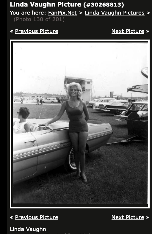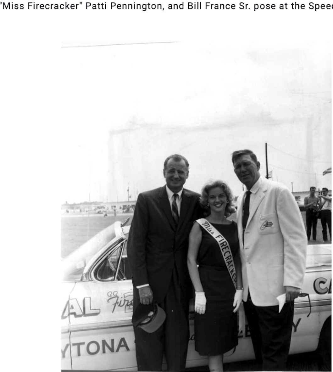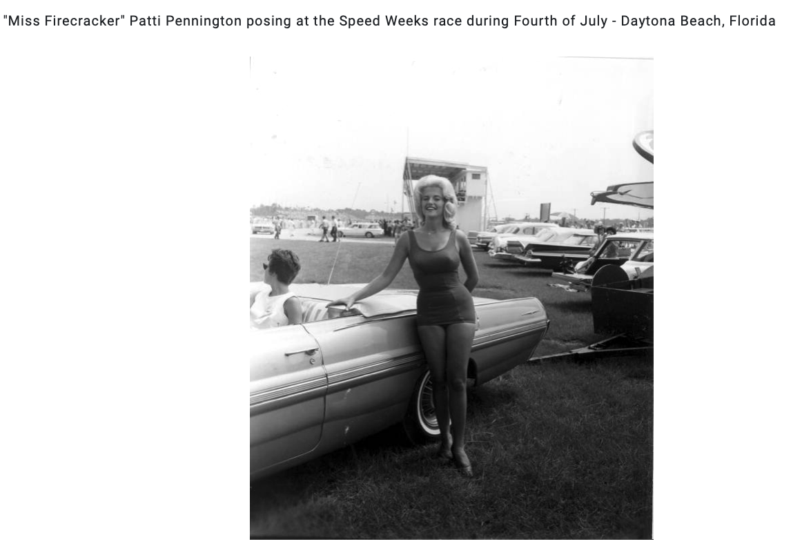 Thanks for pointing that out. The person in that photo is more likely Linda Vaughn. I believe that Patti Pennington is seen in the following photos. DAYTONA BEACH, FL - JULY 4, 1962: Fireball Roberts in victory lane after winning the Firecracker 250 NASCAR Cup race at Daytona International Speedway. (Photo by ISC Images & Archives via Getty Images) Above image is from the program for the 1962 Firecracker 250. Its caption identifies Patti Pennington of Ormond Beach, Florida. DAYTONA BEACH, FL - JULY 4, 1962: Fireball Roberts continued his dominance at Daytona after Speed Weeks by winning the Firecracker 250 summer classic. The following year the race was extended to 400 miles. (Photo by ISC Archives/CQ-Roll Call Group via Getty Images)