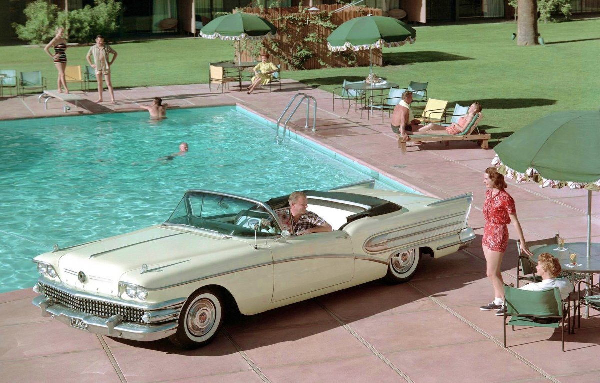 “Hey babe!” “Just got off work and thought I’d drive over by the pool to see how you were doing.” (Kind of a strange placement of a car for an advertisement.)