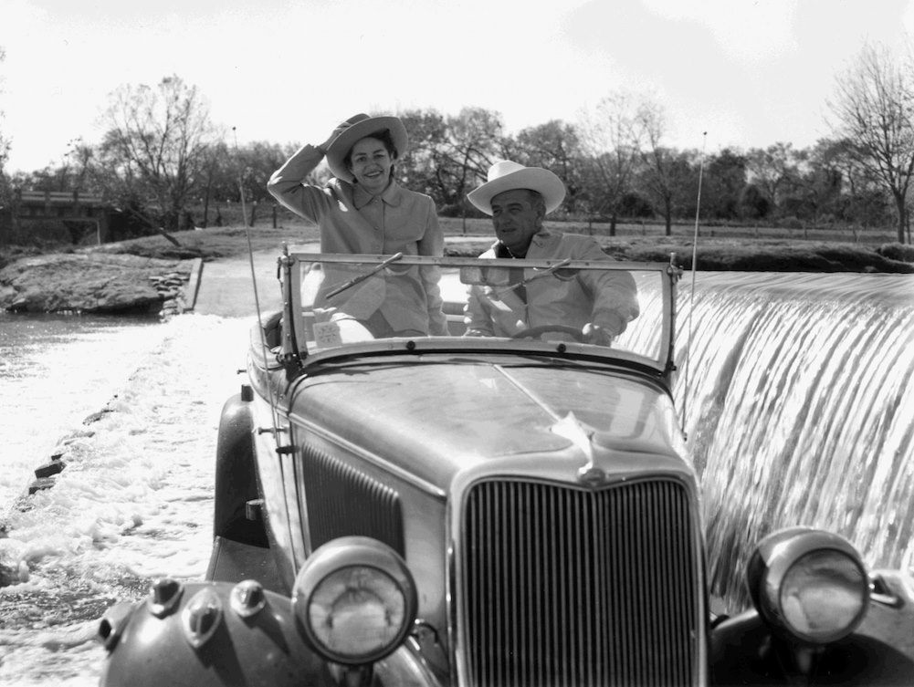 That's Lyndon Baines Johnson and Lady Bird. I wonder if he got a quantity discount on those marker lights!