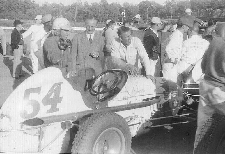 Joe Sostillo with Jimmy Bryan leaning on the hood. Joe and Bryan were best friends and Sostillo was a key member of Bryan's pit crew when he won the 1958 500 Mile Race.