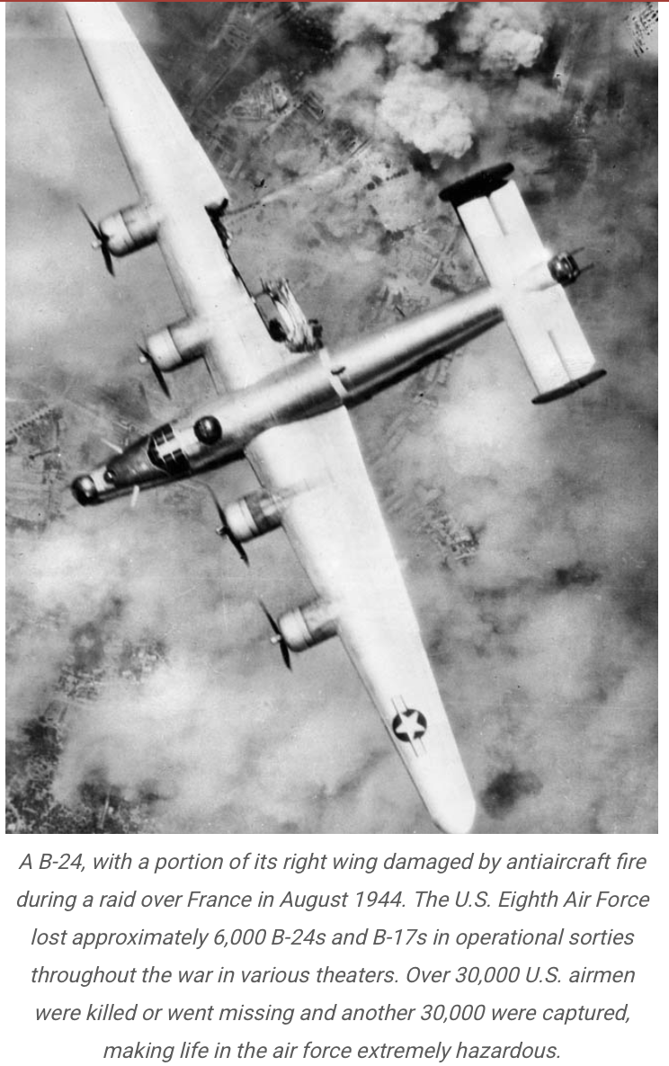 A total of at least 74,242 (some records show over 80,000) US Army Air Corps personnel were killed during WWII. At least 26,000 of those were members of the Eight Air Force which was based in England starting in early 1942. These numbers don't include losses of United States Navy aviators.