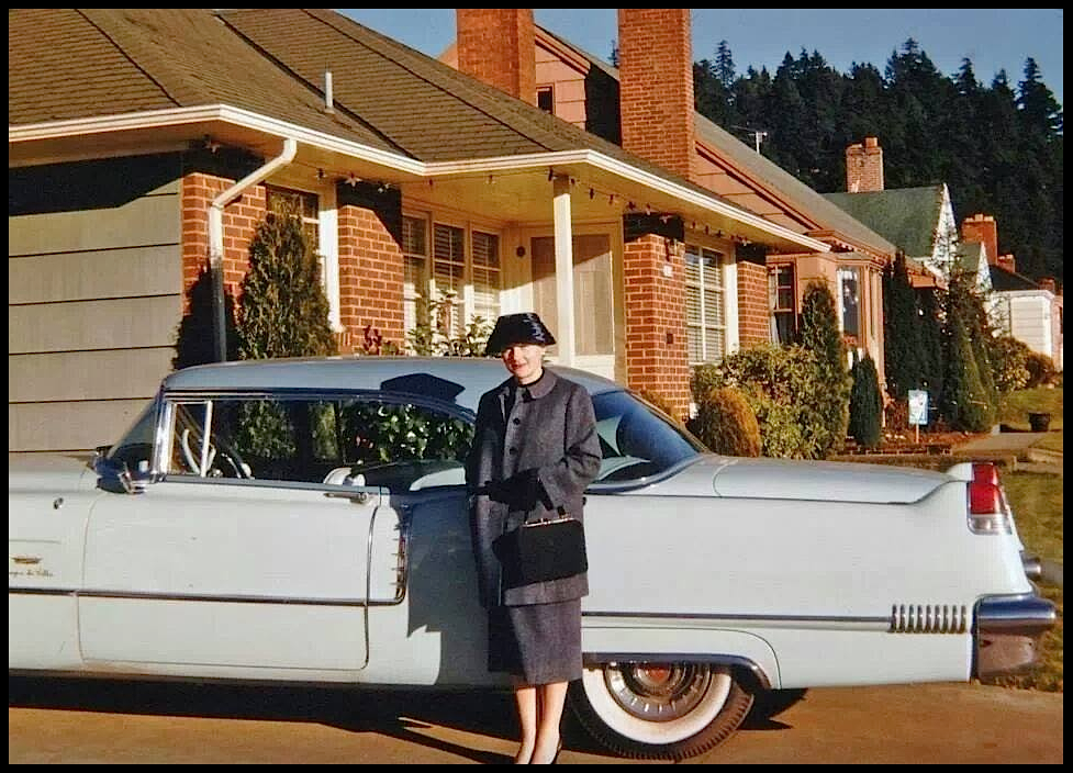 What is the problem? She looks like she is going shopping or maybe to a party in her nice '56 CDV. Seems like an ordinary photo.