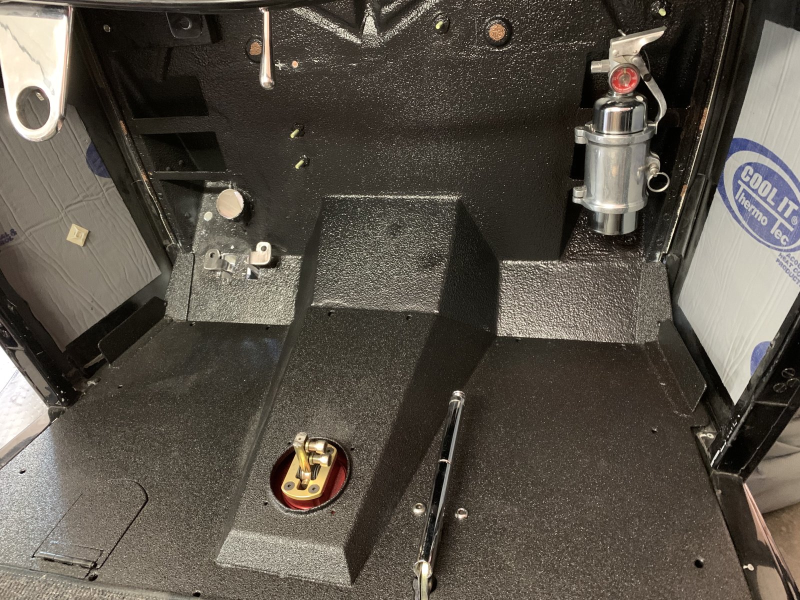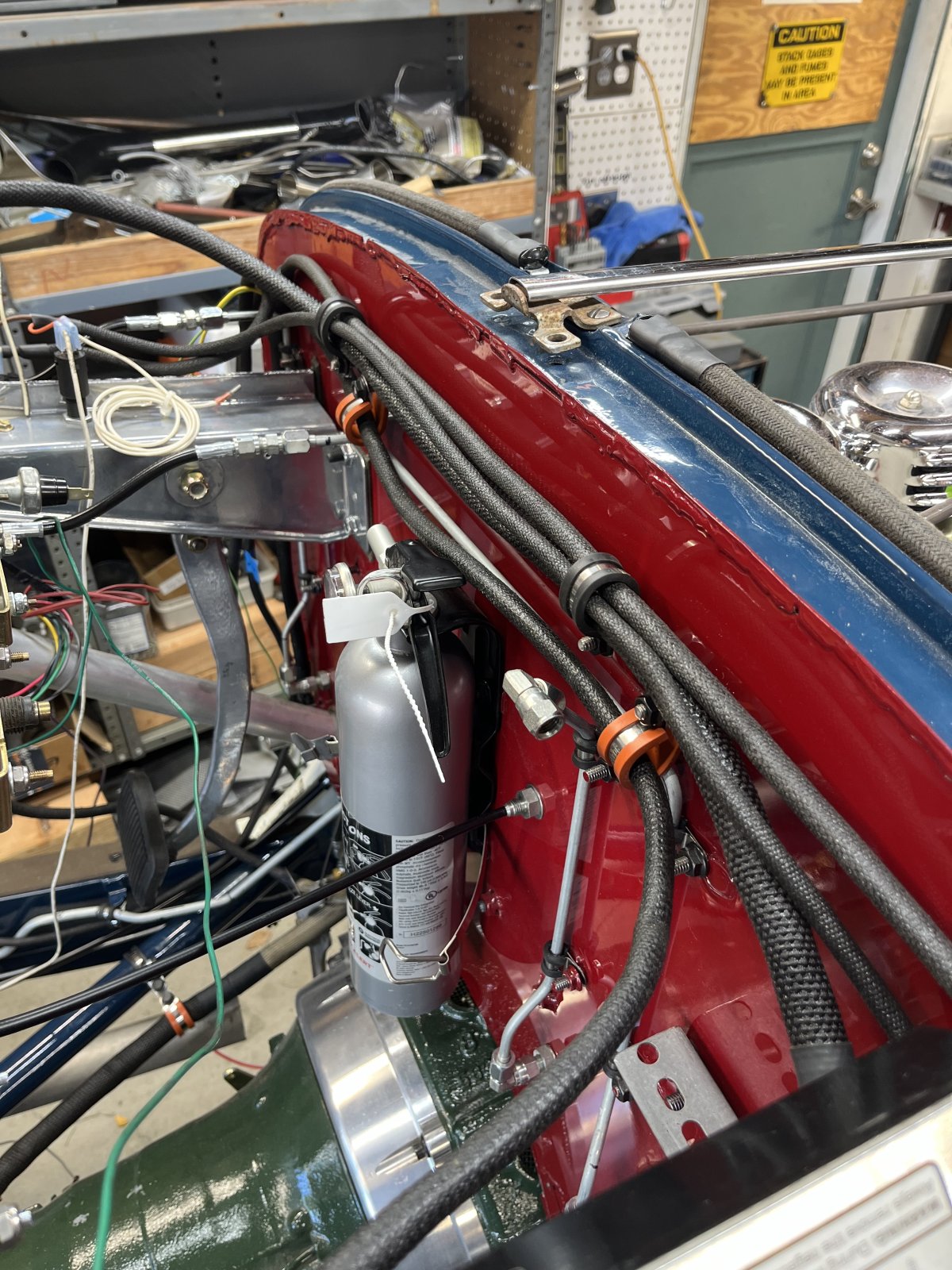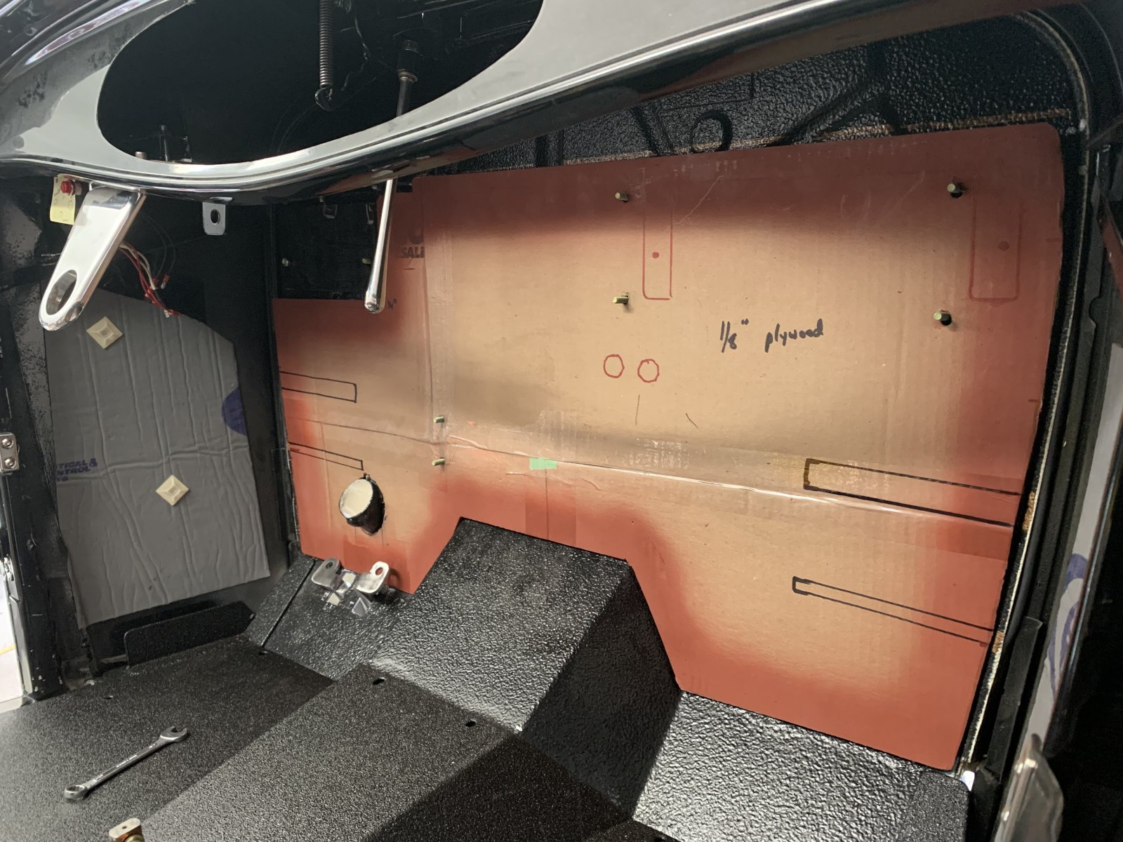 Double checked hand brake location and welded in a bracket w/nuts to facilitate mounting the little fire extinguisher on the firewall. Also started making a template for firewall upholstery.