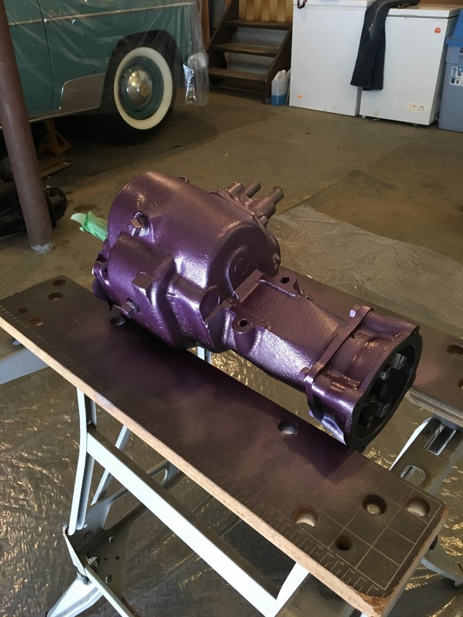 14. Painted the 3spd from our 1950 Styleline. We have it out of the car while I'm doing the clutch and torque tube, so my 5 year old daughter and I degreased and cleaned it up. When I said we should paint it while it's out she said "we should paint it purple!!"