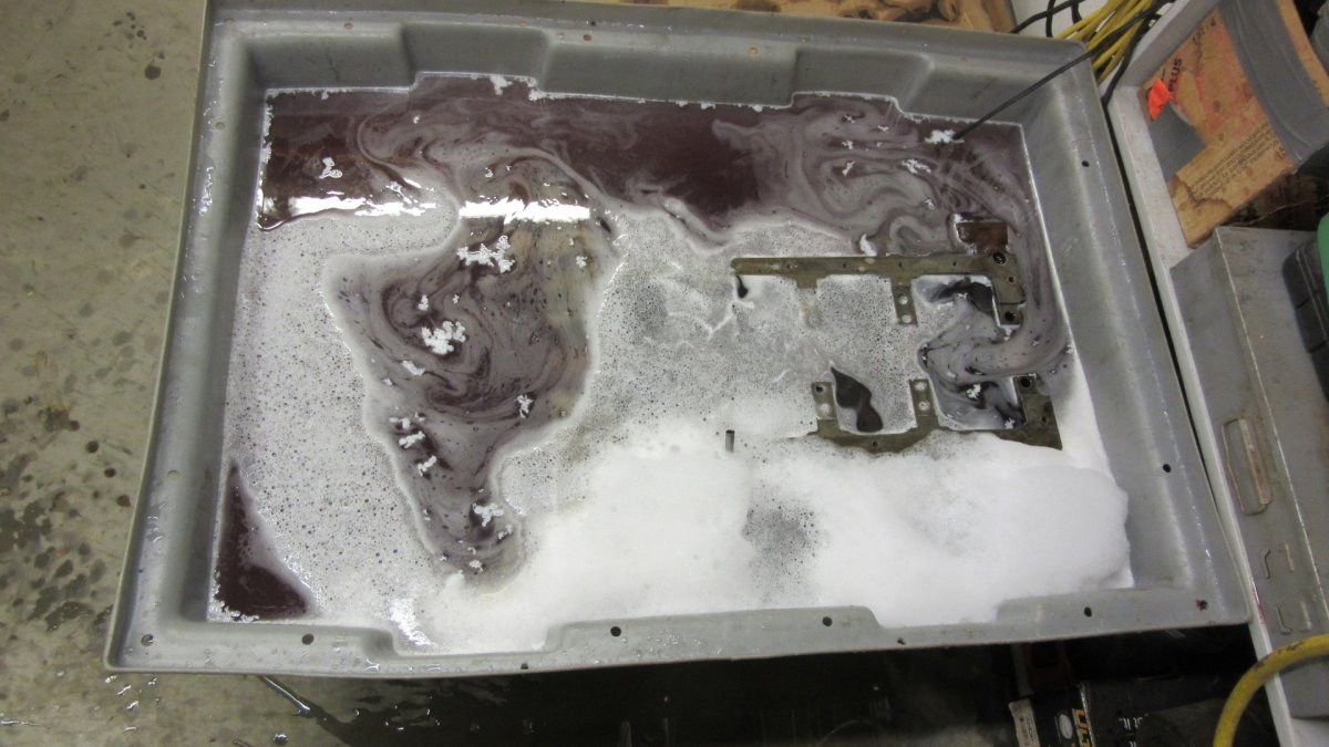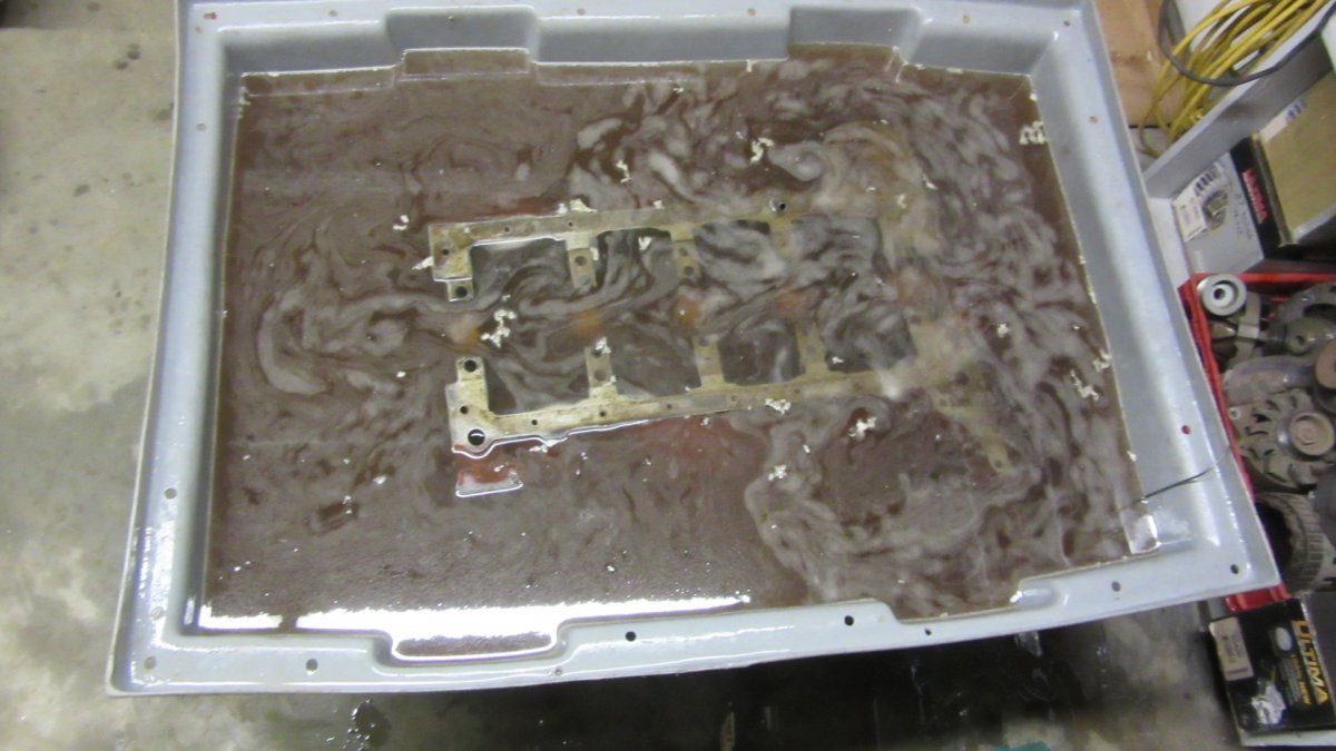 I am cleaning the block for a rebuild , so after a pressure wash and some cleaning with varsol I have it soaking in some purple cleaner. The first picture is fresh cleaner the second is 2 hrs later. I have a heater element dropped in the tub to heat the solution. studebaker build 001.JPG studebaker build 002.JPG