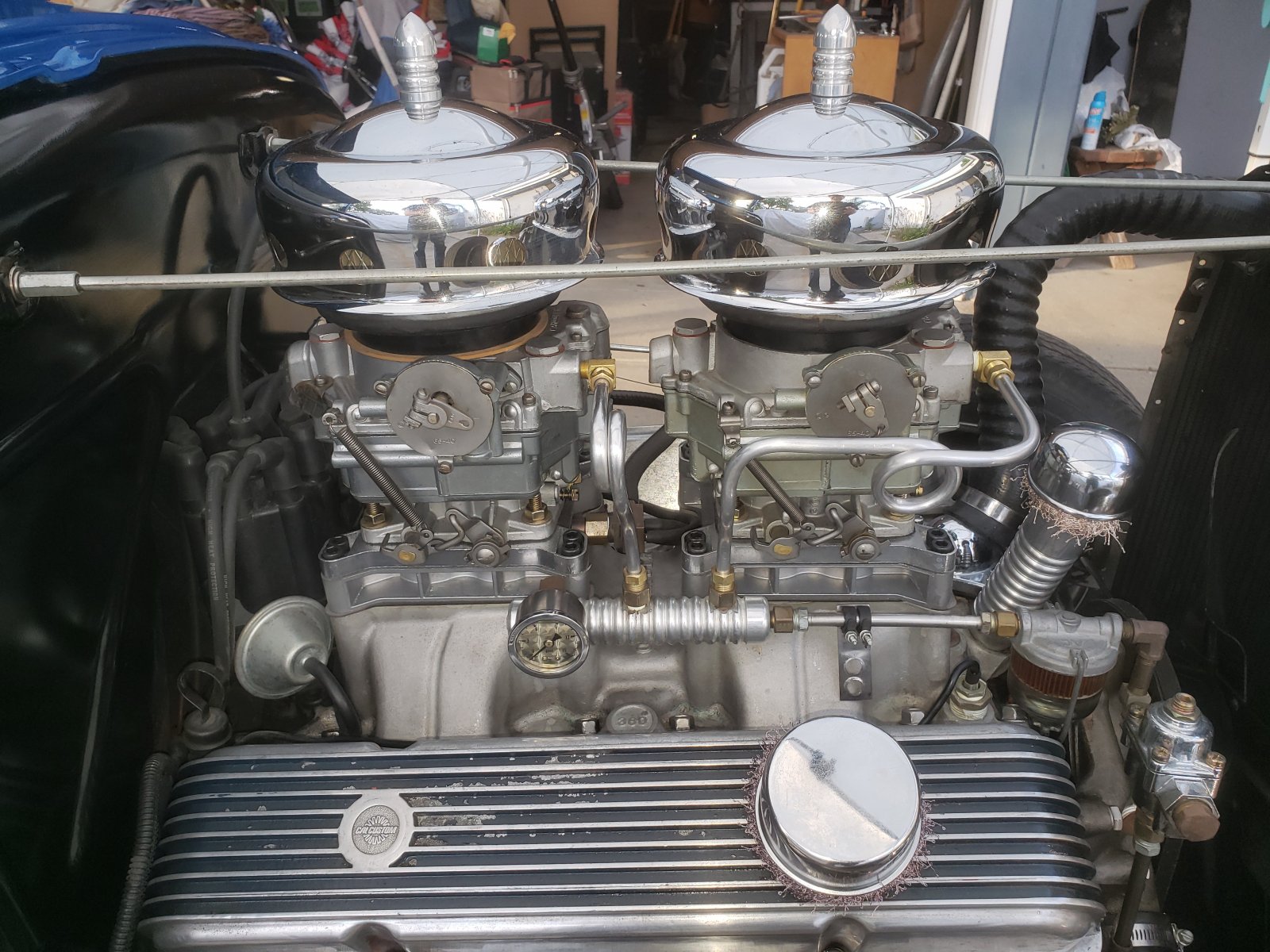 Spent a little time dialing in the new dual quad carbs, it was loading up at idle, causing the engine to stumble, and blowin' some black exhaust when clearing it out. I leaned out the idle air/fuel screws a little and smoothed out the idle, I'll probably have to mess with it more but it's running better now. Then I took her out for a full tank of gas, 9 gallons worth, at the cheapest station in town, $4.09 per gal. (be careful who you elect to your state government....) That's up over a dime since the last time I filled it. Anyway, brought her home and wiped her down, ready for the poker run tomorrow. I'm hoping she runs good when were out there amongst all the other hot rods.