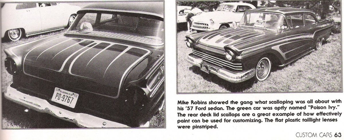 The scallops are a little bolder, the louvers look the same. It has an extra grille bar, but it does improve it`s look. Notice the scalops above the side stainless trim. The roof outline paint matches the scallops on Poison Ivy as well. A close copy or is it the same car. It also has the dice hanging from the rearview mirror. It`s a different car, Poison Ivy has 5 rows of louvers. Lake pipes are tucked in and the spots are in a different location with frenched antennas added. And the seats are different. But all this could of been changed, more than likely not. This car was for sale at the Greenfield Iowa swapmeet in the last 5 years with forsale sign. It was showing it`s age. For some reason, I don`t remember seeing Poison Ivy at the shows Ed posted above. But do remember it from the magazines. Scan0905.jpg