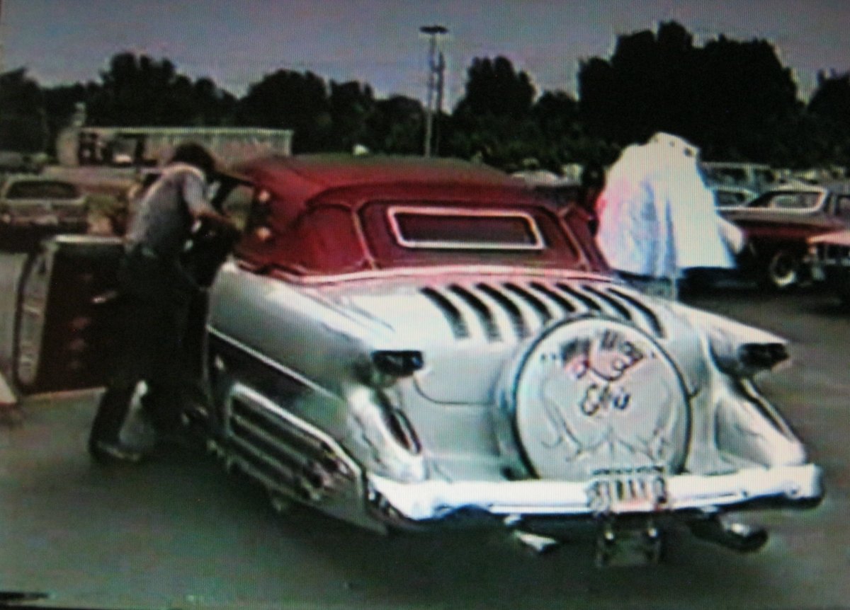 Ok everyone, I've got an update! I finally found the video footage of Phil's convertible and his little Elvis trailer. It was on a video that @PasoJohn sent me of the '88 Leadsled Spectacular in Holland, Michigan with about 30 minutes of footage from the '86 Spectacular (Springfield, Missouri) tacked on. Sorry for the quality of pics, but like I've mentioned many times before, pictures of old video taken on my old TV aren't the best, but I know you guys will enjoy them. Here's a picture of Phil's car where you can see the detail of the taillights. The opening for the two Caddys actually comes to a point, not just an oval opening. Here is Phil's interior at the Spectacular in 1986. Here's some pictures of the interior from Holland, Michigan in '88. This is the trailer. I wonder what Phil carried in there.......... And last but not least is a cool shot of Phil cruising the fairgrounds with trailer in tow. E