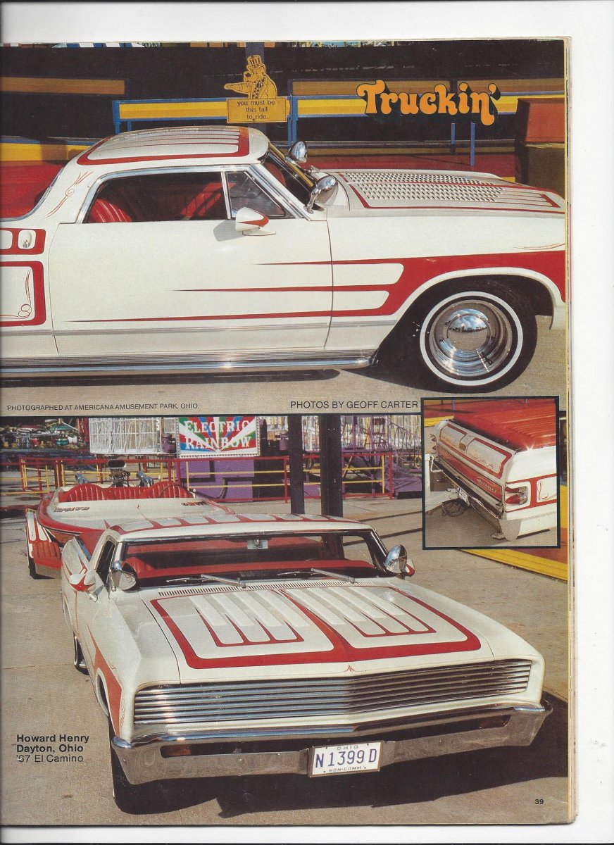 #36... 67 El Camino. Howard sold it to my dad in the mid 80's, Chuck Sides. it was in Classic & Custom magazine as well. photographed by Lee Pratt. we had that car everywhere and to this day no car/truck sounded better. 283 duels with woodpecker mufflers. Howard painted that car to match the speedboat. Artic white & hugger orange. we were in a small town in Kentucky 4th of july weekend. the local police thought that car was the coolest.they called the sheriff in from a murder scene to see it. haha. that's the truth!
