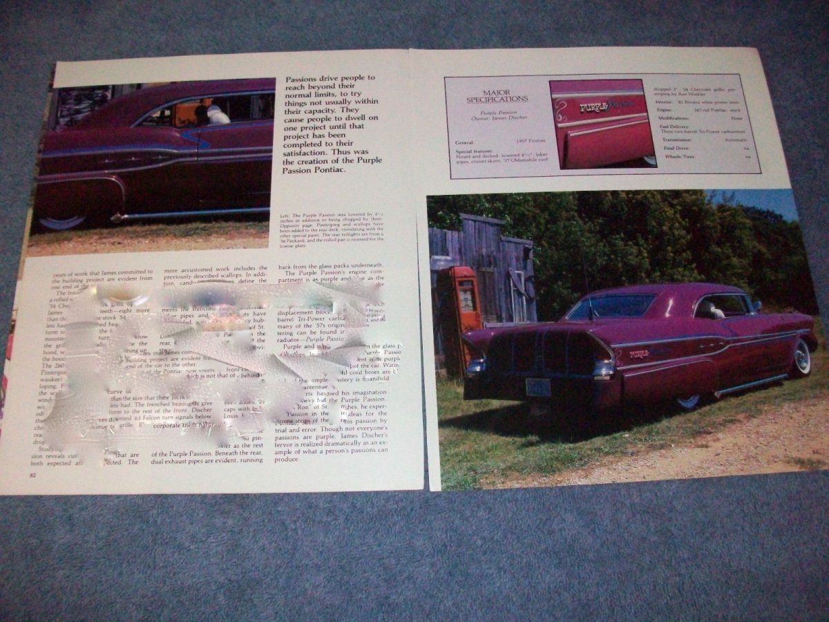 What Ever Happened To..........? number 47. 1957 Pontiac Owner: Jim Discher Janesville, Wisconsin This week's W.E.H.T. was briefly touched on in @straykatkustoms Kustom Blues thread way back in August (2016). @Moriarity posted a picture of it and @Sancho commented on it, and I managed to scour up a little information on it. Well, the car has been in the back of my mind for quite a while now, and it just seemed like this car deserved more than just a passing mention. In the Kustoms Blues thread, I found and posted a picture of the car from the 1993 Winter issue of Custom Rodder Vol. 3 No. 1 on page 56 of their Back to the Fifties coverage. (I'll repost that picture here.) Unfortunately that was the only magazine coverage I could find on the car. In my video research, I found the car was at the 1992 Leadsled Spectacular in Holland, Michigan. Bob "Action Video" Huff must have really liked the car because he shot quite a bit of video on it. I thought that would be all the information I could find of Jim's Pontiac, but I lucked out. It was featured in the Kustom Kemps of America 1980-1992 book. The little paragraph on the car was very interesting and showed this was another car that had quite a history. The Discher's started on it in 1980, and it was completed in 1984. It sounds like it was pretty much a mild custom. As bad luck would have it, the car was destroyed in a garage fire in 1985. It didn't take long for Jim to grab the bull by the horns, and a complete custom re-build was completed in 1989. This time he wanted a more radical style custom and he succeeded. So much in fact that it is really hard to tell that this sled started out life as a '57 Pontiac Starchief. The car was chopped 3 inches using a '57 Oldsmobile roof, and had Packard taillights added. It was completely shaved, the hood was pancaked, and front and rear rolled pans were added as well as a handmade grille. It also featured skirts and lake pipes as well. A unique touch was adding '57 Chrysler quad headlights to give the front of this car a great look. The car was painted a custom kandy purple pearl with wild green, turquoise and purple flames. This is one custom that really stands out and has a look all it's own. Funny that I could only find the car on the video for the '92 Leadsled. It seems that it would have been at many more events due to the fact that Jim was the KKOA state colonel for Wisconsin back in those days. Maybe they were there, but they just missed the eye of the camera at a lot of shows. I'd love to see it in person. Hopefully it's still around and someday I'll get my chance.......... Well, I guess that's all for this week. 'Til next time, stay cool! E