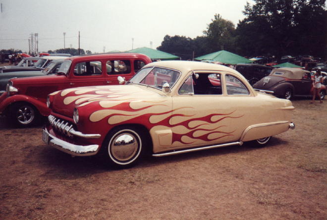 What Ever Happened To..........? number 67. 1950 Ford Owner: Phil Van Tassel St. Paul, Minnesota Phil Van Tassel put together this neat little shoebox prior to 1982. I remember seeing it in Custom Cars by Hot Rod as a kid and I just fell in love with it. Ford business coupes from '49-'51 have always been one of my favorites. I guess what I really liked about Phil's is the unusual tan with the red flames. It really made the car jump out at you. Overall the car was very mild with the usual custom touches like shaved door handles, being nosed and decked and having frenched headlights. A neat scoop was added to the bottoms of the front fenders. An unusual modification that worked very well. The cruiser skirts and lake pipes helped add to the coolness. No chopped top or really wild body mods, making this car look like a mild custom that a kid could have built in high school in the 50s. I know I say it a lot when I feature these cars, but this car was really hard to find information on. A few weeks ago @PasoJohn and I were on the phone talking customs and this car was brought up in the conversation. Since John is from Minnesota and has been in the car scene up there for quite a long time, he has seen a lot of neat cars come and go. John said that Mr. Van Tassel was a police officer in Minneapolis/St. Paul, and he was a regular at events in and around Minneapolis. John took a picture of the car at the 1982 Leadsled Spectacular in Des Moines, Iowa. This is one of the pictures that I will post here tonight. The information on this car pretty much stopped there. This is the first car I've featured that is not on any of my videos. So, as far as I can tell, the car was only at the Spectacular in '82. It might have also been there in '81, but information and pictures of the first two Leadsleds is very hard to find. The only picture I found of it in a magazine was on page 62 in the very same Custom Cars by Hot Rod (Vol. 1 number 5 from 1983) I mentioned above. I bought that magazine off the newsstand and I still have it (lol)! That was it for ink. As far as pictures go, I managed to find some great ones on @Rikster's site that were taken by Kustom Lincoln Lady, as well as the picture taken by Paso John. If you look closely at the picture of the back of the car, you will notice the car has Indiana license plates. I'm guessing that Phil may have sold the car sometime soon after the '82 Spectacular to a new owner in Indiana who showed it for a short time and then it disappeared. I can't say whether Phil built any other customs or not, but in the second KKOA book on page 54 there is a really nice chopped '49 Mercury that was owned by Joseph Van Tassel. With a name like Van Tassel, I'd imagine there is some relation there. So, hopefully some of you Midwestern custom guys--especially from Minnesota, will be able to add some information on these great sleds. Well, that's all for this week. Until next time, Happy Summer! E