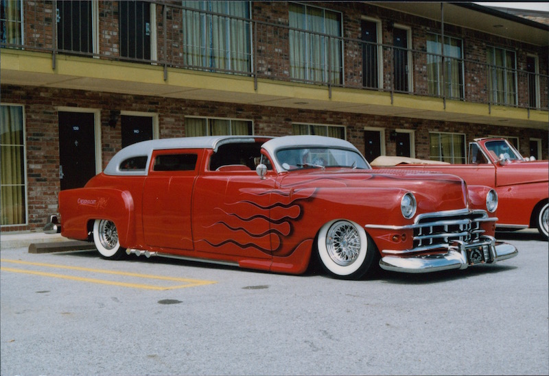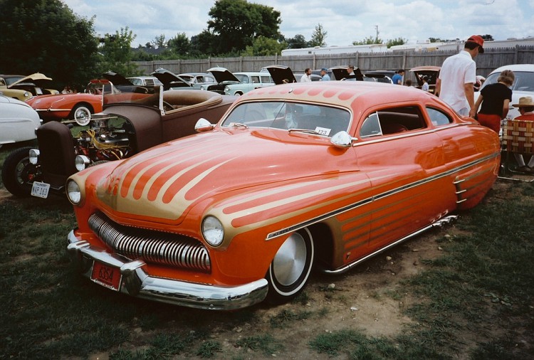 I'm very far from being an expert on the old Mopars, but I'd guess that this car is a '51 or '52 Plymouth. It is disguised very well with all the custom mods to it. I'd gladly cruise it any day of the week! E