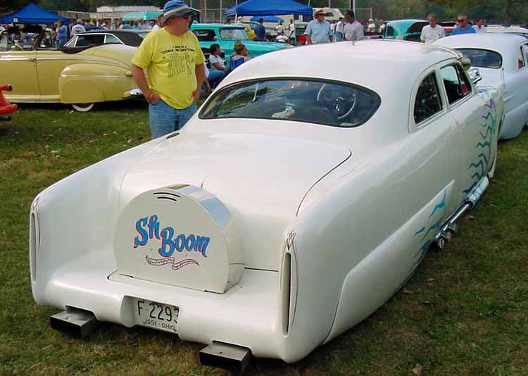 What Ever Happened To.........? number 106. 1951 Ford "Sh-Boom" Owner: Jim Noble Columbus, Ohio This week's custom is one that really changed over the years. It took a lot of time studying pictures and video to determine if it was the same car as it transformed from mild to wild. Jim bought the car in the late 80s, and with the help of some good friends, he put together a nice mild custom. The first time I saw the car was on the 1991 Leadsled Spectacular video shot in Hamilton, Ohio. The car had dummy spots, was fully shaved with bubble skirts and moon discs. It had dual frenched antennas just below the driver's side quarter windows with music notes painted by them and "Sh-Boom" close by in tiny letters. It had rolled pans front and rear with homemade style nerf bars and a Merc grille. It featured four frenched '59 Cadillac bullet taillights. The car was white with light blue flames that were just outlines across the hood of the car and down the sides of the fenders. They weren't solidly painted from the nose back. They were also painted along the fender skirts. It also had "Sh-Boom" lettered on the trunk lid. The car was featured in the first KKOA book from 1993 on page 102. I believe the picture printed in that book was actually before the version of the car I just described on the '91 video. You'll notice that there are no nerf bars yet, and the car was white with no flames. The next sighting of the car was on the 1993 Leadsled Spectacular video from Springfield, Ohio. The car looked pretty much the same as it did back in 1991. The next time I found the car was at the Kustoms of America 1996 Double Date Show in Richmond, Indiana. I have an old video tape of an episode of "My Classic Car" that I recorded off of my TV on TNN (The Nashville Network) from 1997. They covered the KOA show on that episode and I had to record it. Incidentally, on the show coverage, the host Dennis Gage interviewed Roger Jetter (@40StudeDude) and his brother Dan along side of their "Hint of Mint" '57 Chevy. Jim's shoebox had transformed quite a bit by then. It was chopped and no longer looked like a sedan, but more like a coupe. The grille had been changed to a straight bar with bullet ends. The flames on the front and the skirts were the same style as before. It had extended rear quarters with a connie kit and late 80s or early 90s Cadillac taillights. I know they aren't traditional, and many guys wouldn't use them on an old time sled, but they do work well on this sled in the extended rear quarters. I gave them a pass as they are sunk in a good ways and disguised pretty well. The connie kit had "Sh-Boom" lettered on it as well as a subtle slotted third brake light. It still had the super bubble skirts on it and an outside sunvisor. On the video, there was a great close up shot of the back of the car as Dennis bent down to explain how flame throwers work, as well as some great shots of Jim shooting flames during the flamethrowing "exhibition". You may ask how I know this is the same car as it really changed ALOT by then. Well, that part took some time. As I watched the car on video, I took notice of the license plate on the rear. It's the same number on the videos I saw it on as in the photos I found. So, I think it's safe to venture a guess that this is the same Ford. The last time I found the car was on a great video that our own @John B was kind enough to send me a copy of. It was of the 1998 KOA Double Date Show. Mr. Noble was there showing off his custom with pride. It looked unchanged from 1996. After that I have no more information. Sometimes finding pictures of shows like the Double Date, as well as the James Dean shows in Indiana every year can be tough. Jim seemed to stay pretty close to his own Ohio area as well as Indiana. I'm sure some of you custom faithful out in that area know Jim and "Sh-Boom" and may have seen him from time to time over the years. I hope he is still with us cruising around in his wild Ford, having fun throwing flames and putting lots of miles on it! Until next time, get in that custom and go for a ride! E