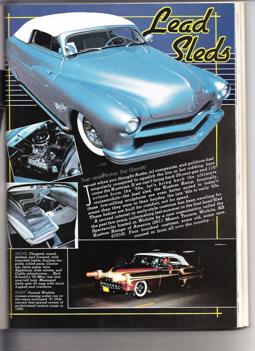 What Ever Happened To..........? number 116. 1953 Chevy Bel Air "Kentucky Sunshine" Owners: Tom & Stella Brewer Bellevue, Kentucky This week's custom is one that really stands out from so many of the '53 and '54 Chevy Bel Airs that were being built and driven around back in the 80s and 90s. There are a few things that really stand out about this one. The first thing has to be the bright yellow paint with the black painted insert between the chrome strips on the quarter panels. It was very close to a color combination that Chevrolet put on these cars back when they were built, but it was never very popular and was rarely seen back in the 80s or even now for that matter. The other has to be the unusual choice of the '55 Chrysler grill. I'm sure that it was a lot of work to mold it in and get it to look right. I think Mr. Brewer or whoever did the work did a great job! The car is pretty mild as a whole, but sometimes less is more. The car had some early 70s Chrysler taillights that were installed in place of the stockers. Now before you traditional custom folks out there groan and roll your eyes, I have to admit they look pretty cool and the choice worked quite well. I wish I had better luck in searching for more pictures of this custom, as it looked great on video and many of the details of the body mods and interior were shown there. More about that in a bit. I had a hard time figuring out the time frame on this one. I was only able to find the car on two videos. It was at the 1991 Leadsled Spectacular in Hamilton, Ohio, and the 1992 Spectacular in Holland Michigan. It may have been there before, but I have no video from 1988-1990, and I only have bits and pieces of videos from shows from 1995-2002. I had no luck in my search for pictures of the Brewer's Chevy on the internet. Also, in my search for the car in print, I came up with very little. It was in the 1st KKOA book on page 177. There was just the one picture, but the write up on the car was very informative on the details of the car. That was all I could find. The Brewers may have been around these shows for just a short while and then went on to other things, or the car was changed extensively and isn't recognizable like it was here. At any rate, let's see what we can find out about the Brewers and their "Kentucky Sunshine" Bel Air Chevy. I hope everyone out there has a wonderful Memorial Day. Over the holiday weekend, we all need to be sure to take a moment to reflect on the brave men and women that paid the ultimate price for our freedom. Also, remember those who serve and have served so that we can enjoy the wonderful life we have here in the United States! Thank you Vets! See you next week! E