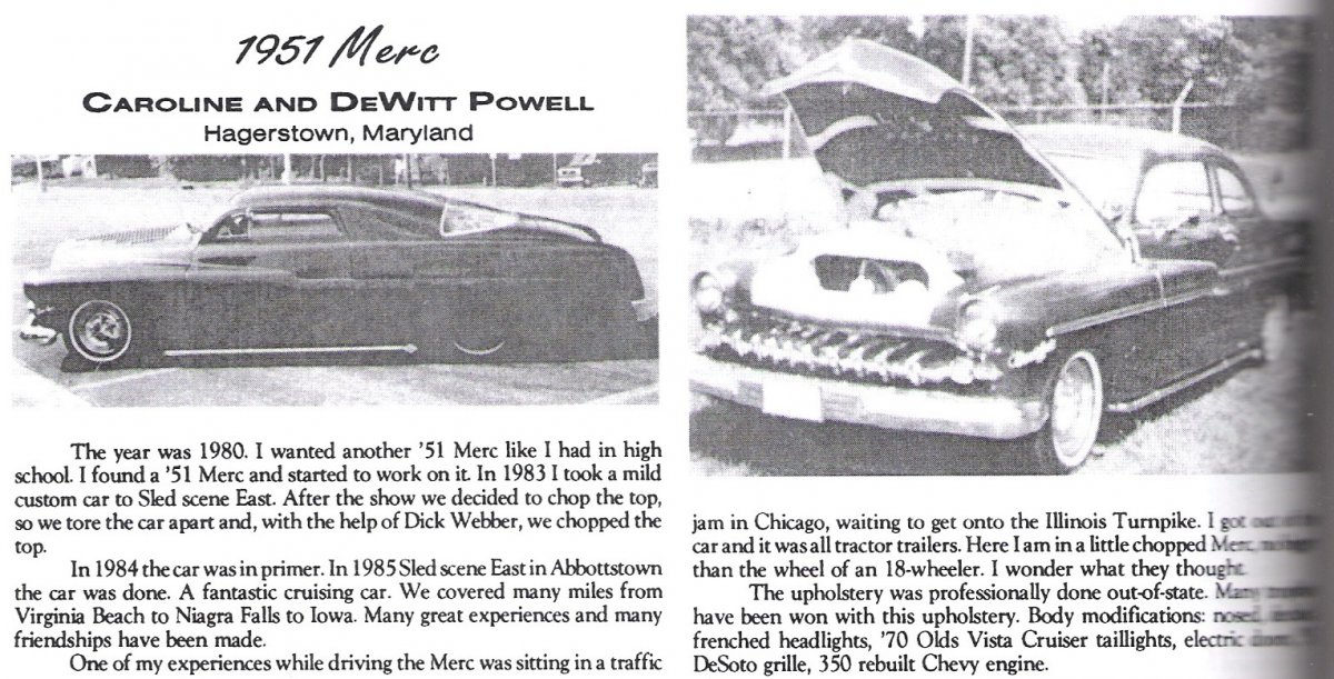 What Ever Happened To..........? number 128. 1950 Mercury Owners: Lee and Adie Krueger Richland, Nebraska How can anyone that's into customs not love a chopped Mercury? Lee and Adie Krueger built one in the 80s that had all the good stuff. Nicely proportioned chop, rounded corners, louvers, custom grille and on and on. One of the things I really like about this car is their choice of wheel covers. The Plymouth Satellite covers have always been a favorite of mine, but aren't used on Mercs much due to the fact that they are 14 inch. To me, the Krueger's Merc looked great from top to bottom. Lee and Adie Krueger seemed to take to the smaller KKOA shows. Their favorite seemed to be the "Last Pass" show that was in Des Moines in the late 80s. I did extensive searching and I wasn't able to find it on any Leadsled Spectacular or Sled Scene East videos that I have. As far as pictures go, my usual internet sources came up empty. The first pictures featured in this week's post were sent to me by @PasoJohn who took them himself at the "Last Pass" show in Des Moines in 1988. Thanks John for sending me the pics! John told me that he remembers seeing the Kruegers many times at the Last Pass over the years. The Kruegers car had a unique interior that was maroon and white candy striped tuck'n'roll. The one thing in the interior that was an unusual choice was the chain steering wheel. Common in lowriders but rare in a custom. Looking for other pictures and information in books and magazines didn't turn up very much. The only other picture I found of the Merc was from the second KKOA book on page 35. According to the book, the Kruegers still owned the car as of the time of the book's printing (2003). The car had under gone a color change from the reddish purple to a brilliant gold, but other than that the car looked pretty much unchanged (at least from what I can tell from the picture). The candy stripe tuck'n'roll was still present. After the 2003 KKOA book I found nothing more on this rare leadsled Merc. I hope that Lee and Adie are still enjoying the neat Merc they put together over 30 years ago. Where does the time go? Until next time, see you around..........E