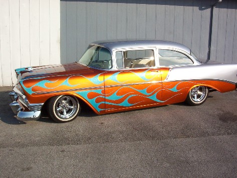So-called 60s style probably actually got started around '57. It's Identified by custom wheels instead of Hubcaps, skinny whitwalls instead of WWWs. More Semi Customs with really extravagant paint graphics Ala Larry Watson style. Rear wheel openings were opened up to show off the custom chrome wheels and for a sportier look rather than ground dragging full skirts. Fender wells got tuck & Roll covers in them with colored lights lighting them up when cruising. MetalFlake was new and BIG, but usually it was used on the roof and the rest of the body would be a candy or pearl. Cars were lowered as low as the local roads (and cops) would allow and a few custom cars had hydraulics to be able to slide into a parking lot shooting colored sparks off the titanium skid plates. Hydraulics weren't just for "Lowriders" yet. A lowrider was the driver, who sat slouched down in the seat real cool, not a type of car then. The 60's style got corrupted around the time the GTO and R/Ts and Roadrunners came out, and the style got changed to a more hotrod, "muscle car" influenced multipurpose car. It might have been customized but it could also have "hotrod" perforance wheels and tires instead of "look cool" wheels and whitewalls. Those muscle cars pretty much stagnated a lot of peoples desire to build rods too, because a GTO would be cheaper (by the month) and a lot of guys got drafted in the mid 60's and that brought the whole street culture to a nap, for lack of participants. So 60s style is probably from '57 to around '65, then it starts changing into what continues into the 70s style.