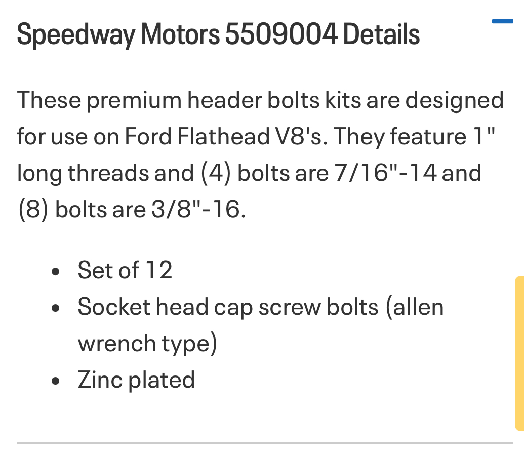 No bolts, no gasket on the front header flange. I remember at least one of those bolts is 3/8 x 16, they both may be. The others are 7/16 x 14. Can anyone confirm that so I can buy a couple of SS bolts and locks on my way home?