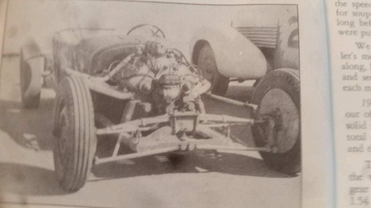 Rootie you got me snooping with your suggestion of an offshore connection which by the early to mid 1950s when this image is likely period correct to...may have been an option My first hit was an Alvis...which had a very similar suspension with origins around 1934... I thought despite looking like a possible winner it seemed a little heavier than what we're looking for...and there wasn't any frontal pics to see the lower struts and where they mounted... I searched on and came across this... https://www.oldclassiccar.co.uk/speedex.htm This is a page of Speedex aftermarket parts for British application to a pretty sizable road racing market which still flourishes even today... I suspect in the 50's it was probably available in some manner to North America just as the cars themselves were... So perhaps in land speed, racing and even good Ole Hotrod this stuff was in the mix...and Don Blair being around the culture of Racing perhaps saw this suspension and applied it to his own purposes...is it a Speedex unit...I'm thinking it is...they had 2 types one wider than the other... There is a chance it's not but it sure as heck looks like it... @rudestude and the others suggesting a flipped crossmember are also correct in identifying how this went together...
