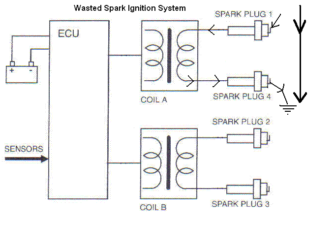 Your source is correct. In the past, the secondary winding in the coil was grounded at one end then hooked to a spark plug at the other end. Today's wasted spark systems are basically that secondary winding with the ground wire cut, and another plug inserted in it. You now have a spark plug at EACH end of the secondary winding, instead of a ground at one end and a plug at the other. In order for the coil output to go anywhere it has to jump TWO spark gaps at the same time. In the "wasted spark" discussion, most of what is being said is actually true, but possibly misunderstood. Here is an explanation of how it works. Click on the pic to enlarge it, and follow the current path. The secondary side of the coil is wired slightly different from the old traditional "single-coil-wire-to-the-cap" that most of us are familiar with. Here the plug-coil-plug are wired in series. When the coil fires, both plugs MUST fire at the same time. YES, one plug has the opposite current flow from the "other" plug it is paired with. Notice the current path, and my crude arrows. Follow from the top. The current passes from the grounded engine block, to spark plug number one ground electrode. Jumps across to the center electrode of plug number one. (Direction- ground to electrode) It travels through the coil winding, then to the other spark plug. At the next plug (cylinder number 4) it jumps FROM center electrode TO the ground electrode (opposite direction of plug #1), then to the engine block to complete the circuit. YES, one of these paired-off spark plugs has a "positive" center electrode, and one has a "negative" center electrode if you have to describe it. I am not aware of any that reverses polarity during running.