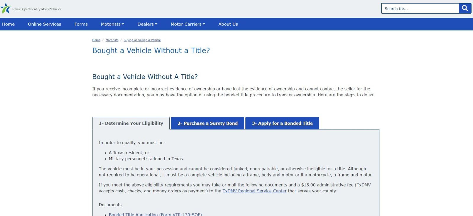 Go directly to the source... https://www.txdmv.gov/motorists/buying-or-selling-a-vehicle/bought-a-vehicle-with-no-title