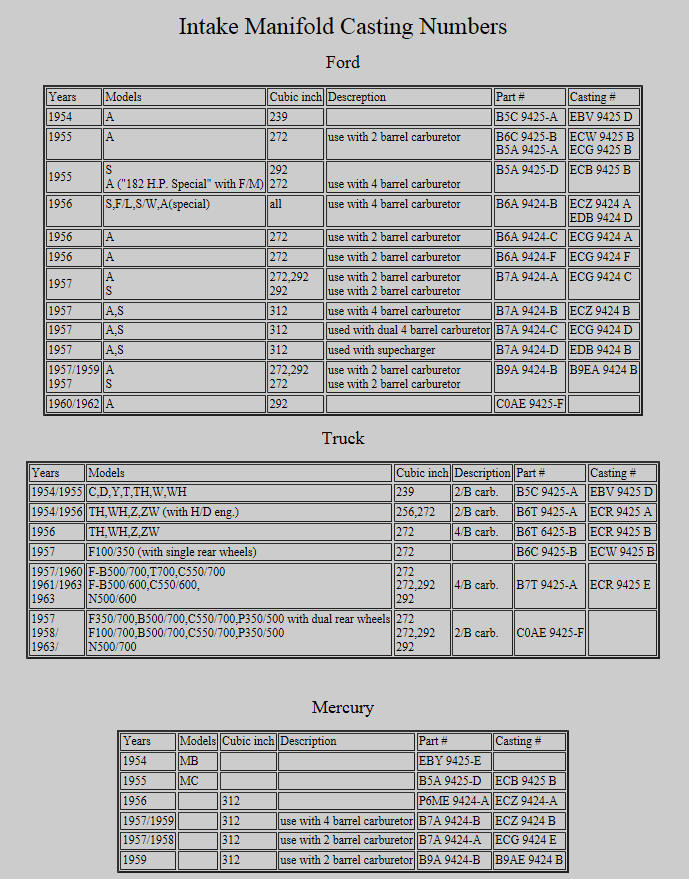 You need the whole casting number to tell what you have got so the short answer to your question is yes, there are several different 9425-B intake manifolds. Regarding manifold numbers, here is a chart from the Y-Block-Info website listing intake manifold numbers for the small Y-Block engine family (239-312): (remember anything 4 barrel 56 and earlier is a "Teapot" base, and 57 up is "Holley" base)