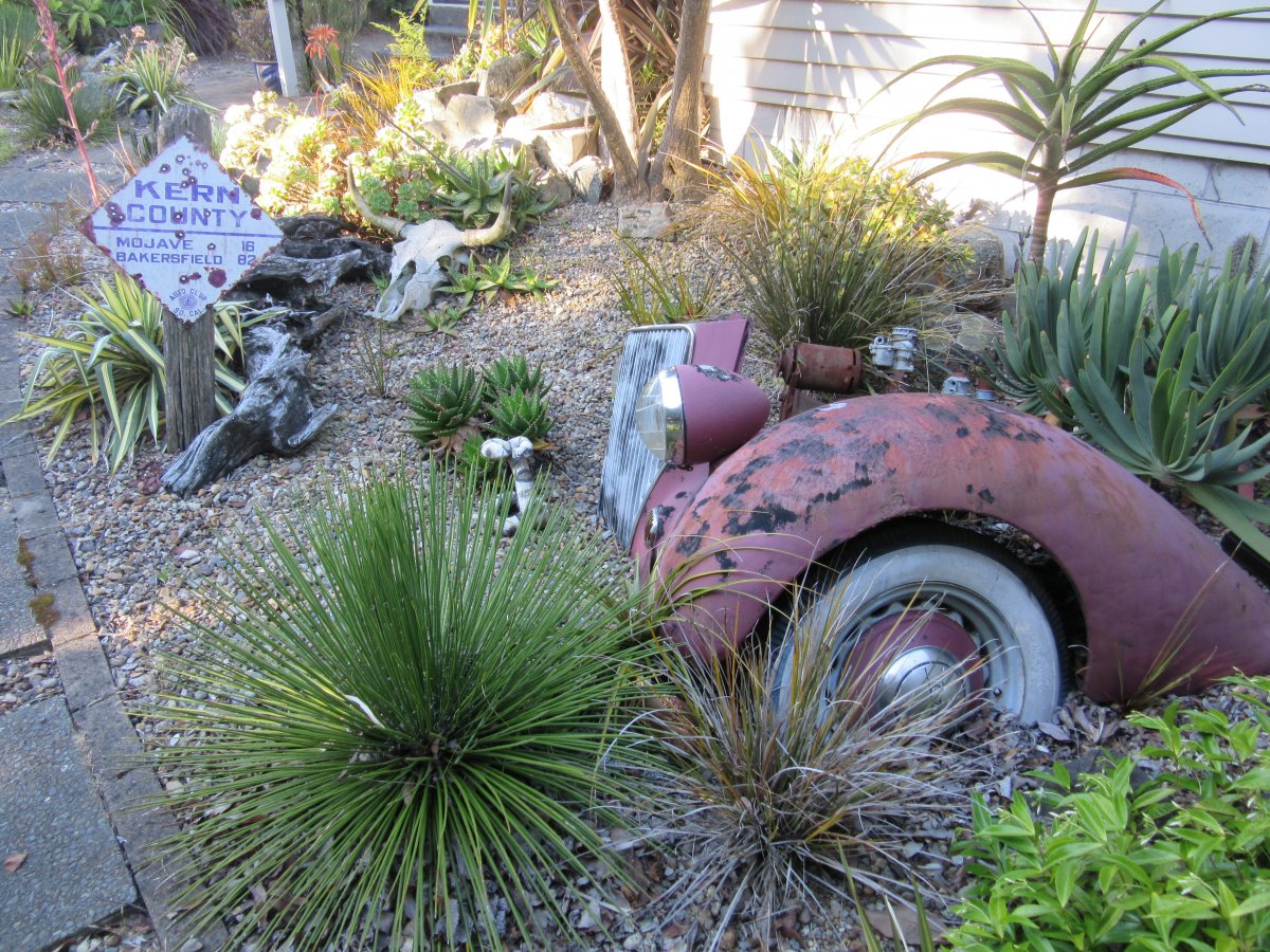 This reminds me of the project I was working on tonight: garage art made from the front end of a Jaguar sedan I stole the suspension from. I plan to hang it on the outside wall of my shop, and then screw some creatively "shattered and stretched" sheet metal to the outside wall around the car's front end,, so it looks like someone drove their Jag through the wall by accident.