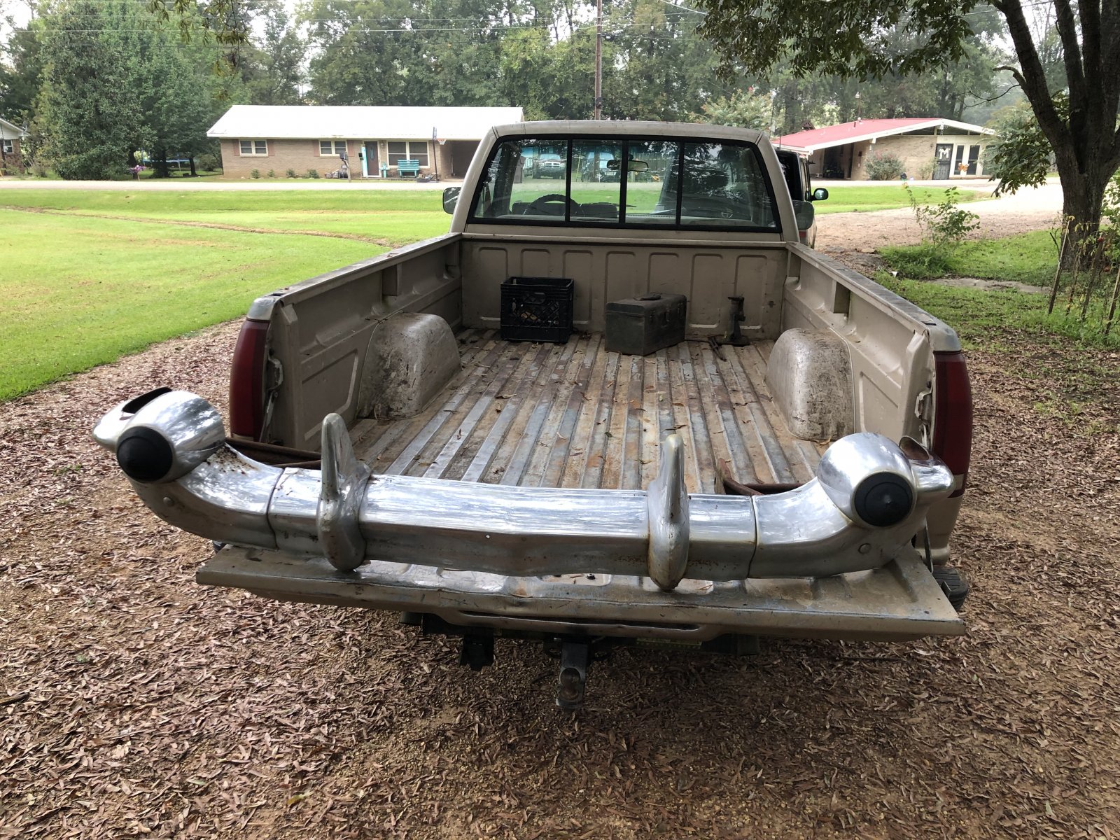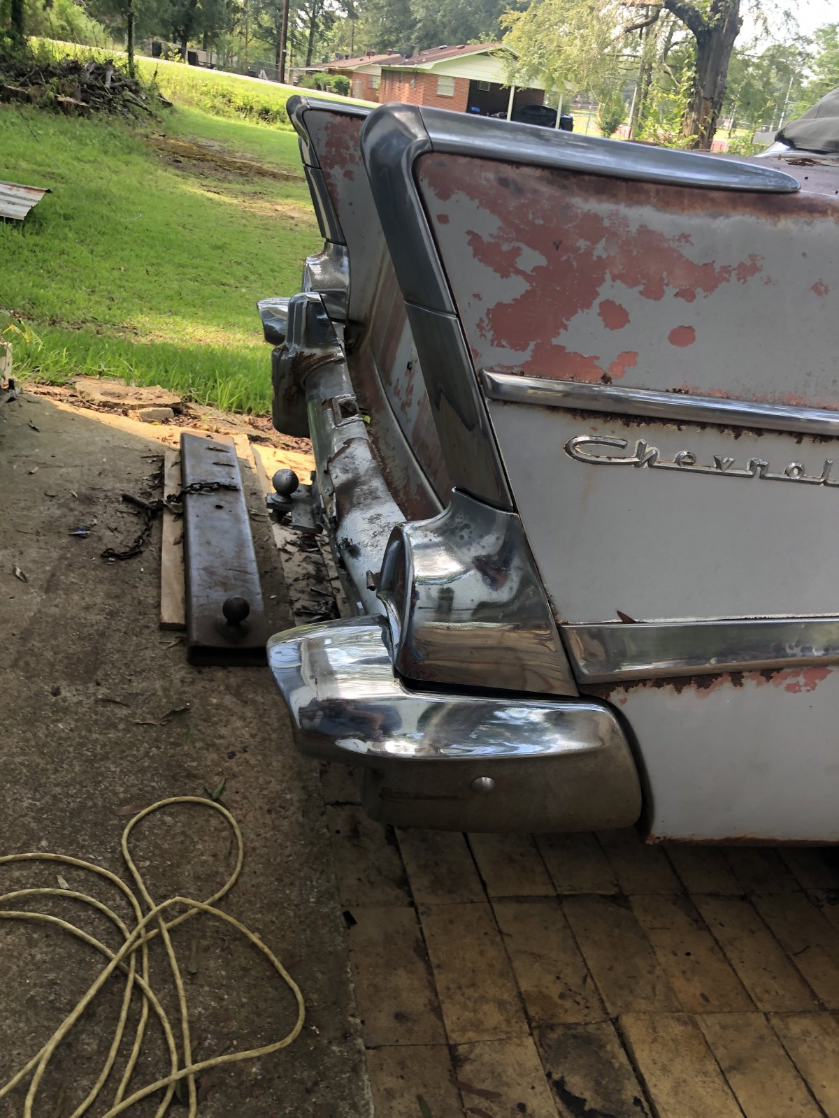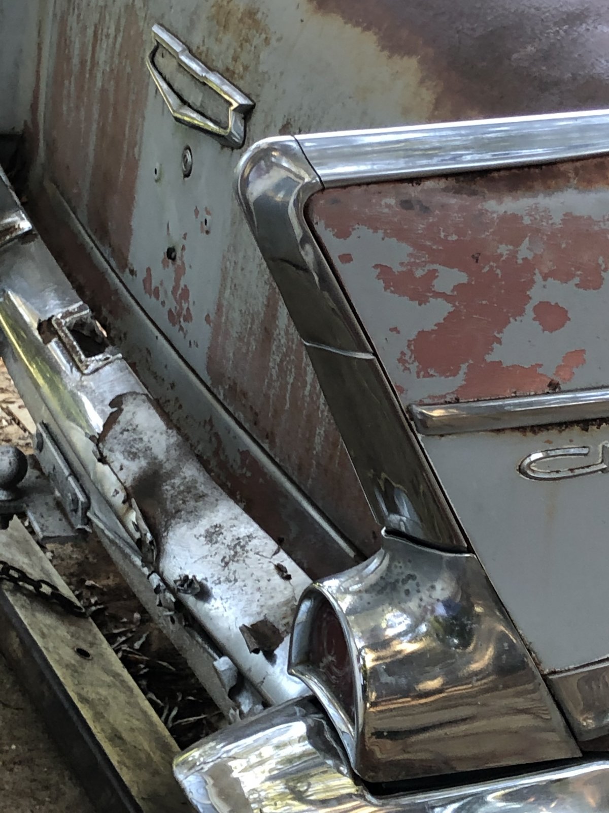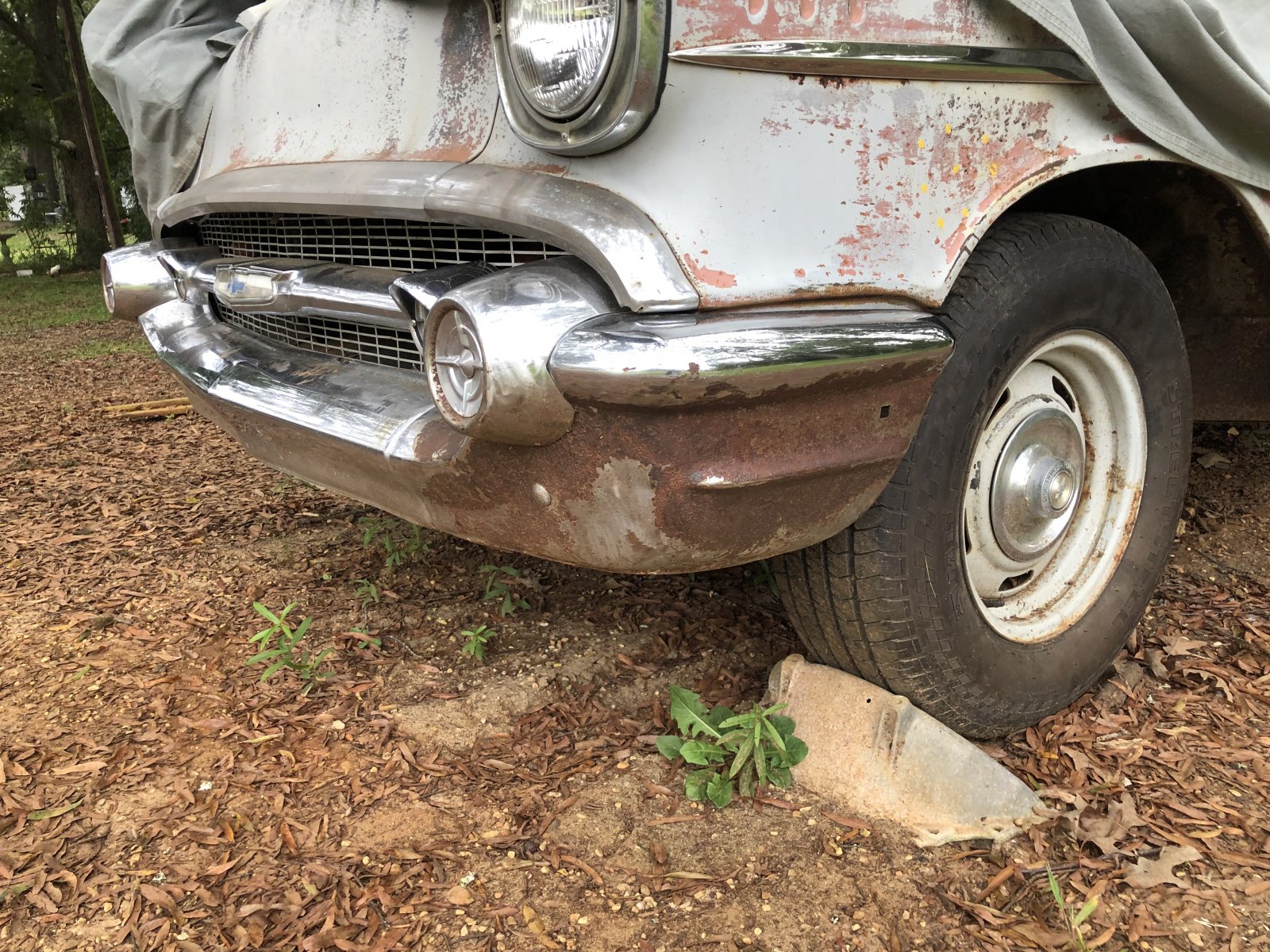 Major score. A friend of mine that has a 57 gave me a bel air bumper/back up light delet plates/and a champ 500 steering wheel. The driver side front corner is better than mine and between the two I can make a decent bumper and not look new or bad. I also got the brackets. All of them including the one that bolt to the bottom of the front fenders. Got some bumper guards as well. They along with the back set could be fixed and plated. They will be available soon cheap. Real cheap I am not a fan of them. None of the rubber snubbers will be used either. I like the delete plates front and rear.
