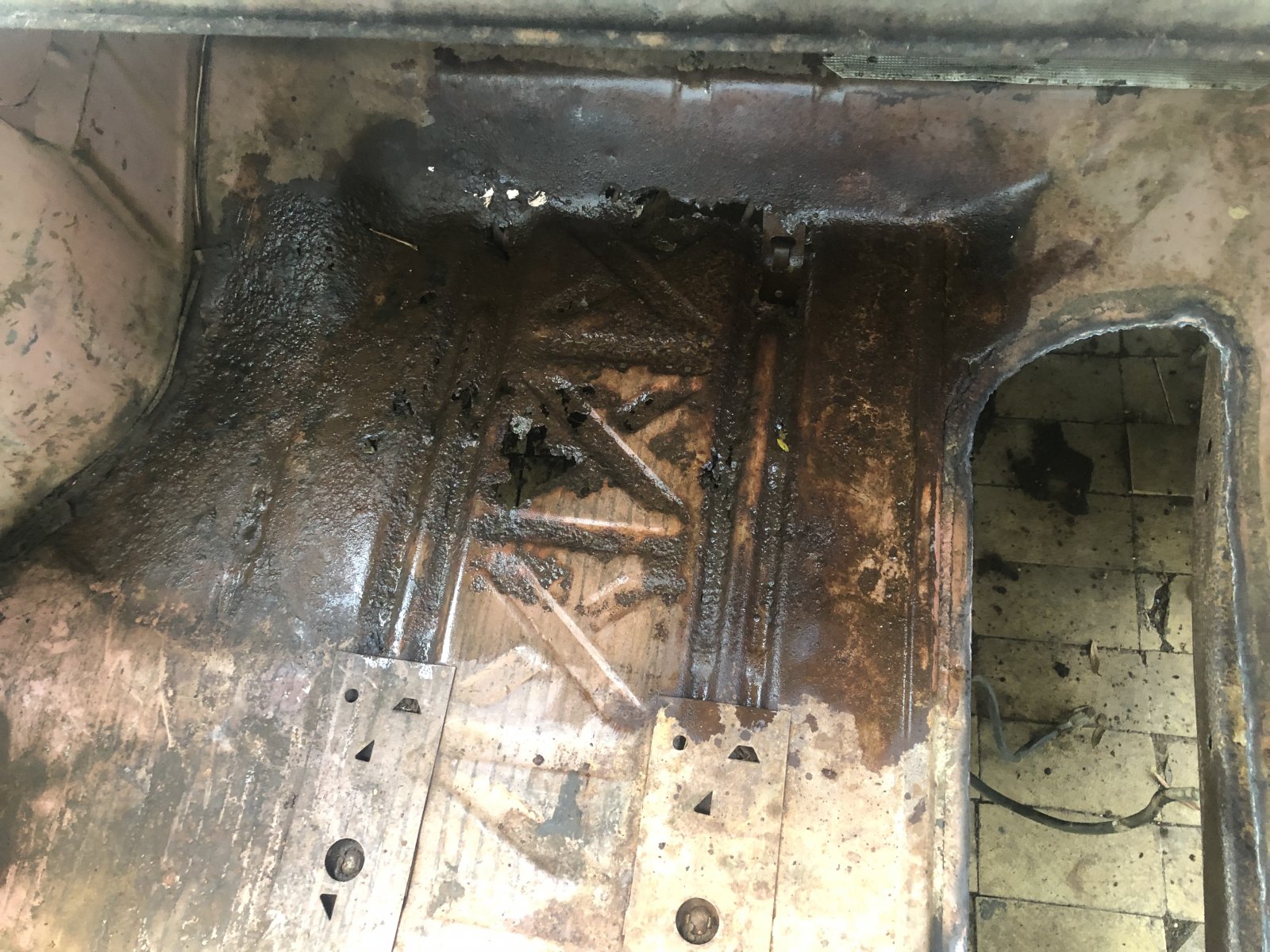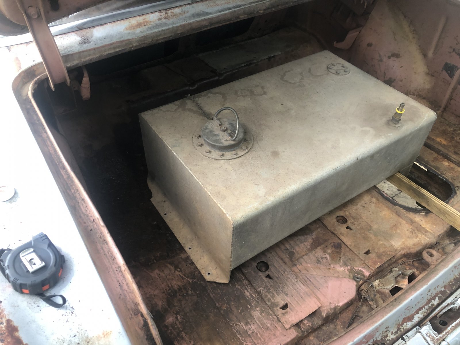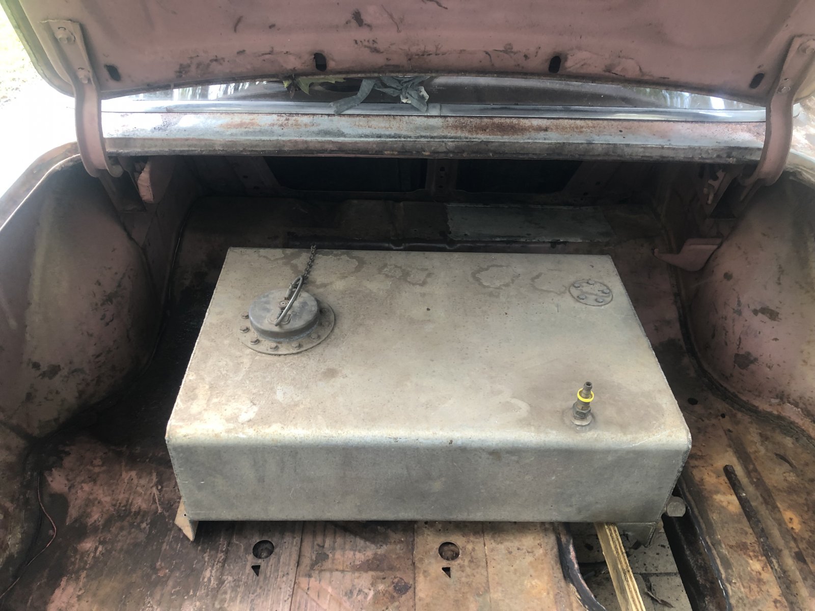 Cut out the spare tire sump. Always hated the way they look anyways. Cleaned out and found some metal termites. And treated them with mechanics lindane ( ospho). Tends to kill and neutralize metal termites for ever. This is what I have in mind as far as the fuel cell. It has 2 plus inches of mounting bracket. And they can come off. Might put a inch or two below the floor and use a bolt in ring to locate and seal.