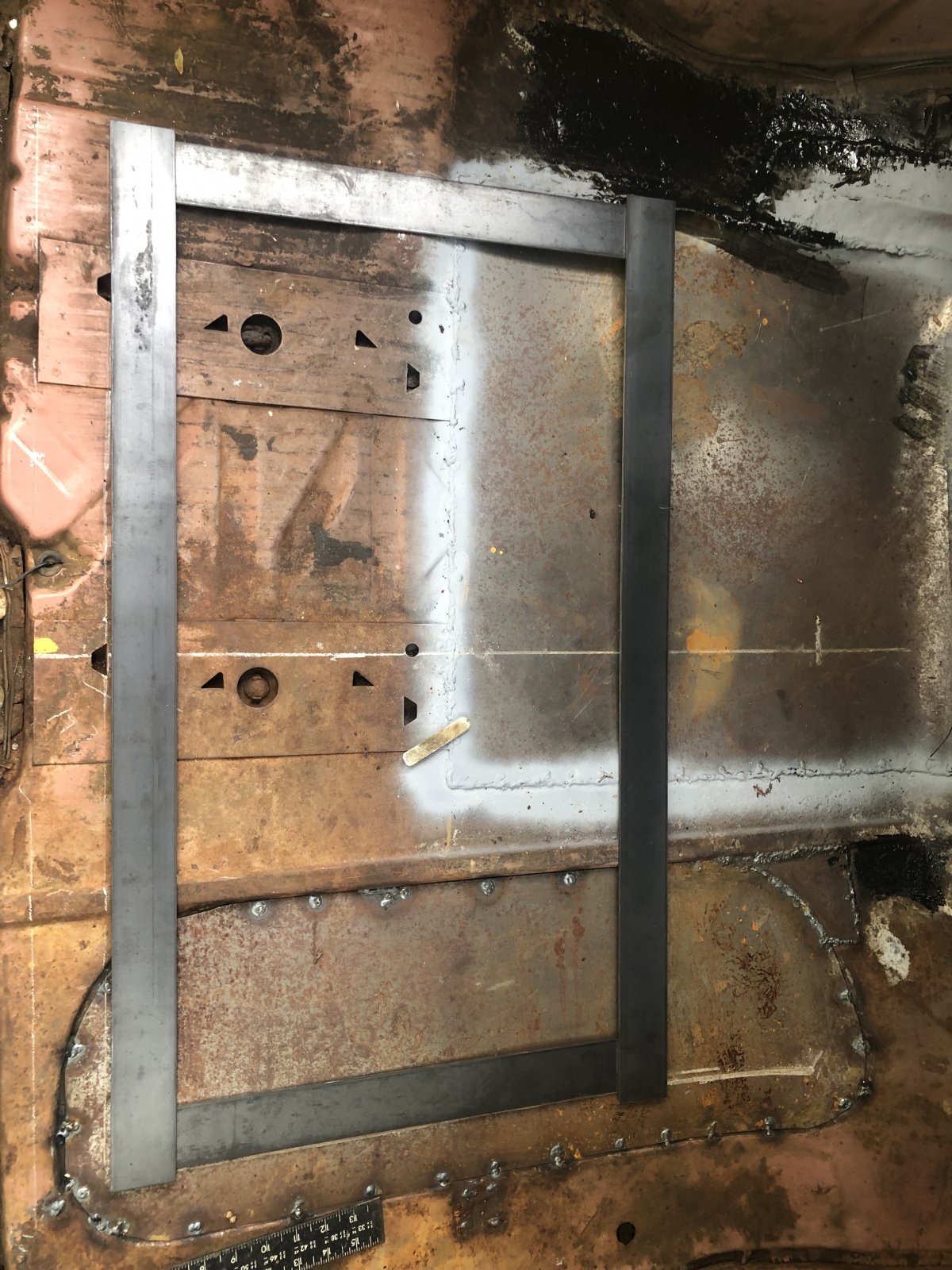 Frame base for fuel cell mounting. I’ll decide wether I’ll weld or bolt it in. It’s amazing to me how much weight /mass the factory believed a stock floor board /trunk pan could support. Most hanging from below. Wow.