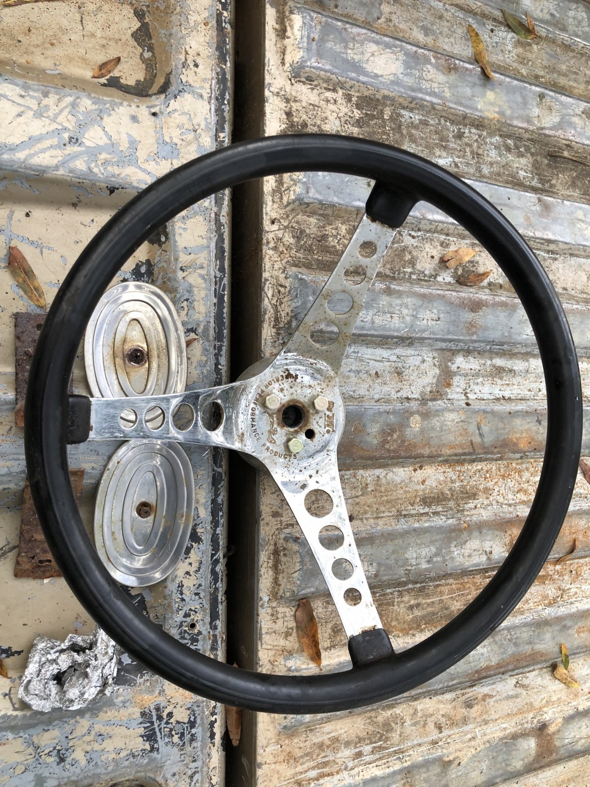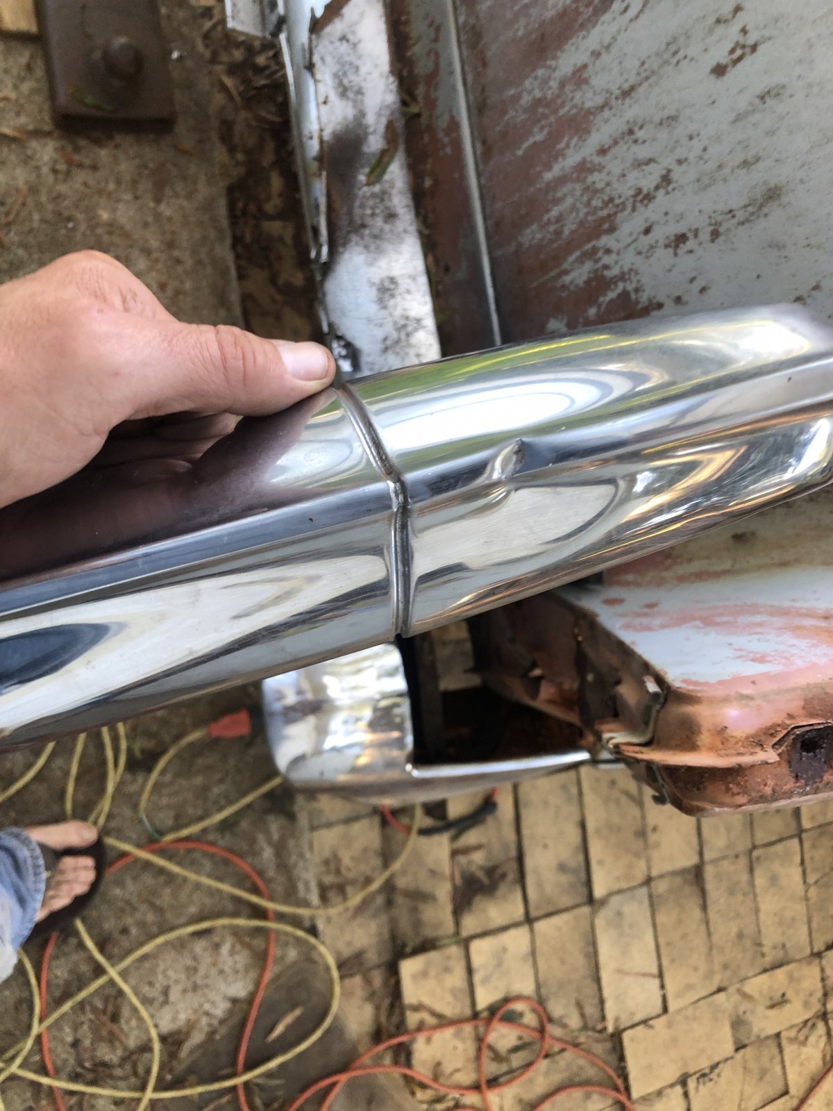 The driver side front bumper section. Not bad for aluminum dust /acetic acid /salt and flower. Old fashion small wool buffing pad and a very old craftsman drill. Then some old fashion turtle wax chrome polish got all the rust spots gone. Scratches cleaned up but they are still there. And that’s OK. It will do nicely. Now got to make the rest Match
